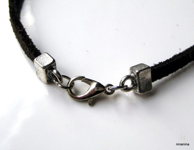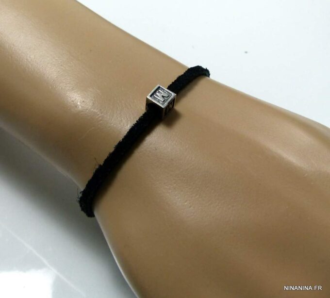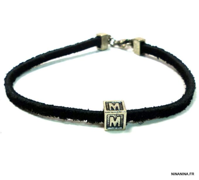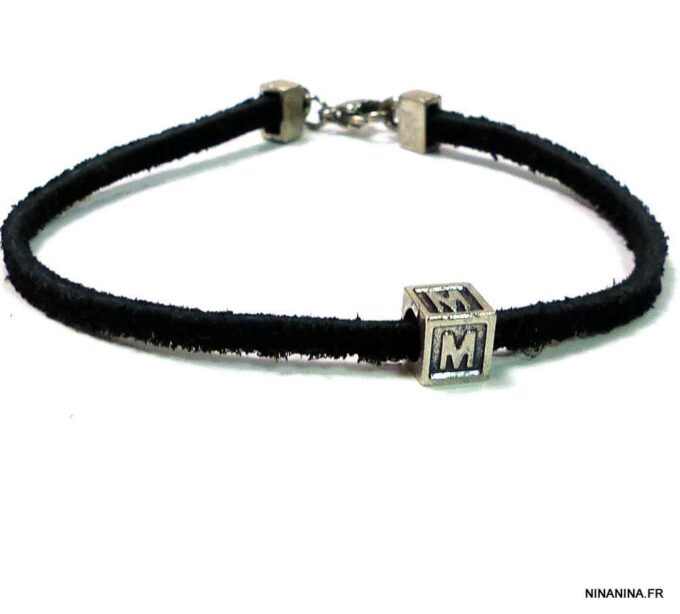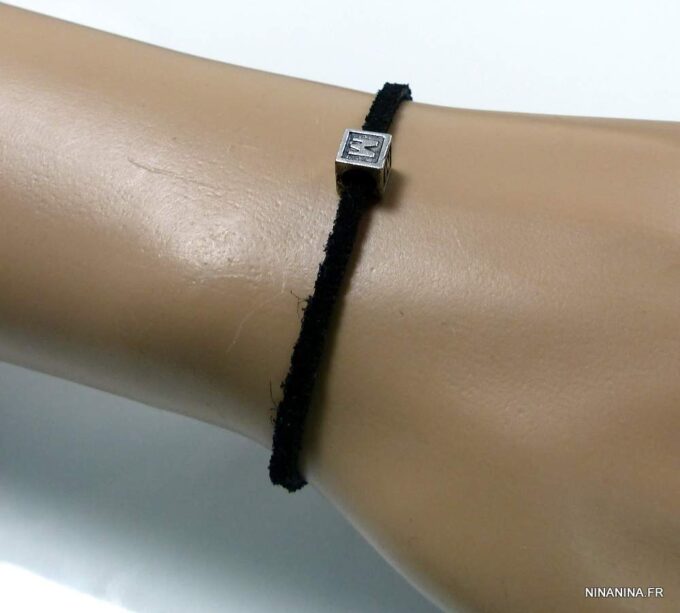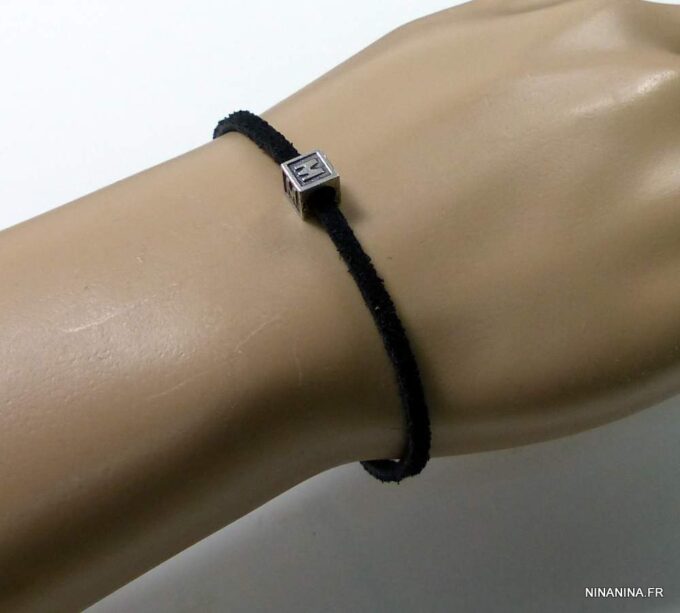 Bracelet cordon daim et lettre métal argenté composé d’une perle lettre carrée en métal argenté montée sur un lien de daim marron chocolat . Largeur du lien : 3 mm. Existe aussi naturel, turquoise et noir. Longueur (fermoir compris) : 21 cm env (pour homme) et 19 cm env (pour femme). Fermoir mousqueton; Livré dans sa pochette d’organza. Bijou 100% fait main.