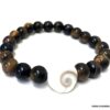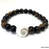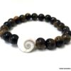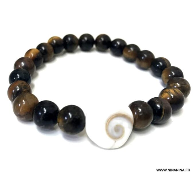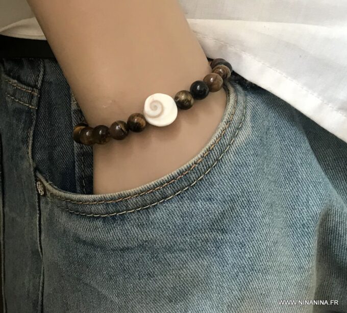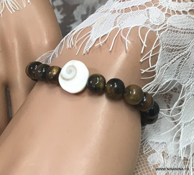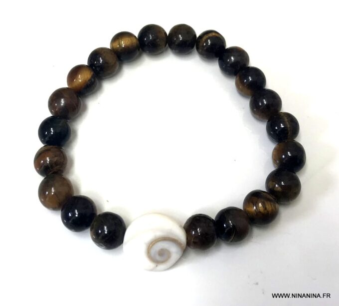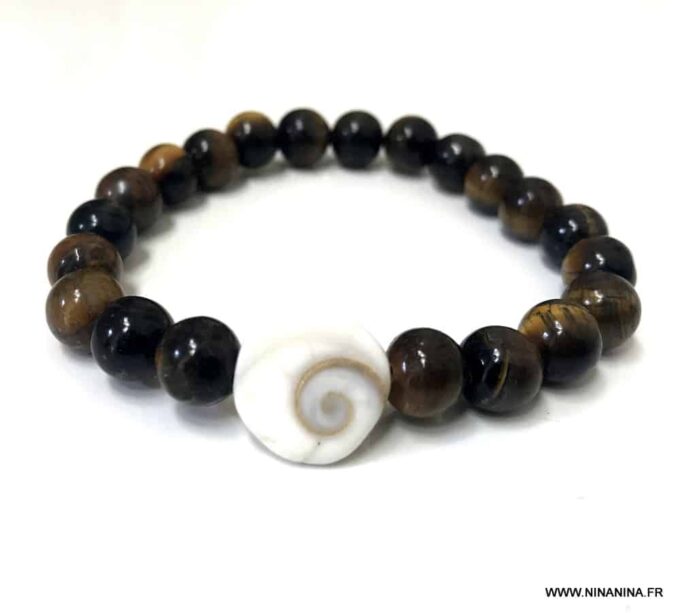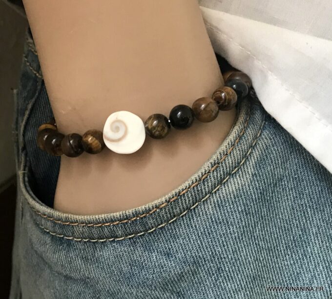Faites un heureux ou une heureuse avec ce Bracelet Oeil du Tigre et sainte lucie homme et femme composé d’un coquillage oeil de sainte lucie monté sur un rang de perles en oeil de tigre naturelles sur fil elastique.