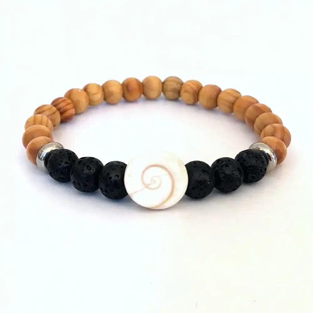 Emportez la chance partout avec vous grâce à ce Bracelet œil de sainte lucie véritable pour homme composé d’un coquillage oeil de sainte lucie monté sur un rang de perles de bois rondes marron clair, de perles de lave noires centrales et de rondelles en acier inoxydable sur fil elastique.