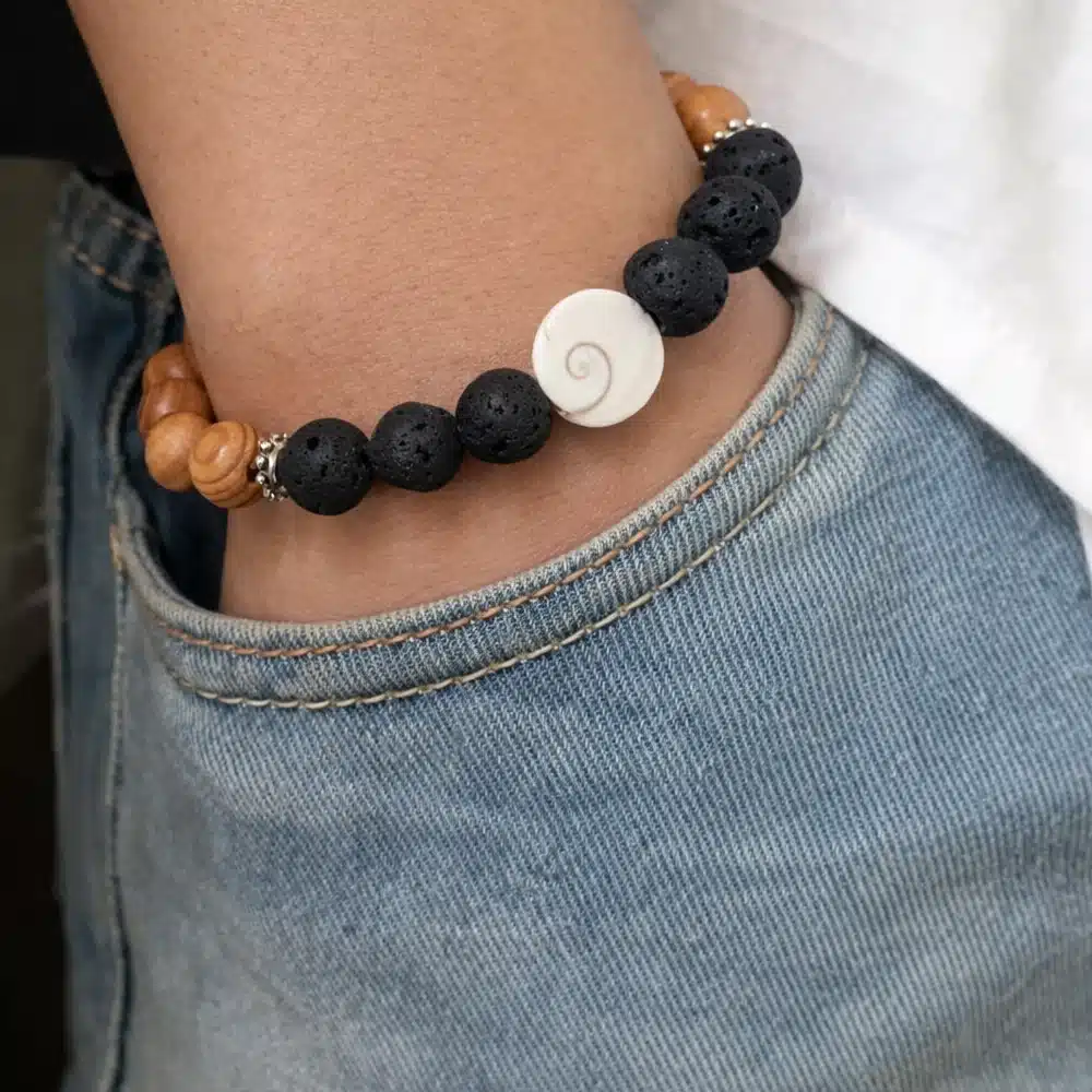 Ce bracelet homme en perles de bois et pierre de lave dégage une classe sans pareille, irradiant au poignet sa puissance minérale et son élégance virile! Un bracelet à offrir à un homme adepte de bracelets en pierre fine, qui satisfera son envie de se démarquer. A porter seul ou mixé à d’autres Bracelets Ninanina pour un style qui vous sera propre !