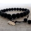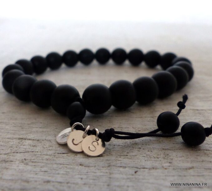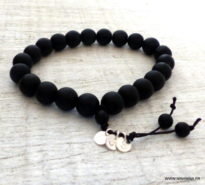 Habillez votre poignet avec les initiales de vos enfants ou faites en cadeau emprunt d’émotion avec ce Bracelet homme perles onyx noir Argent personnalisé, composé de perles en onyx noir mat et de pastilles rondes gravées en argent 925 montées sur un cordon elastique. Gravé à la main, ce joli Bracelet en boules d’agates noires mates de 8mm avec ces breloques gravées en argent 925 fera un cadeau parfait pour la fête des pères par exemple. Style assuré et virilité décuplée!