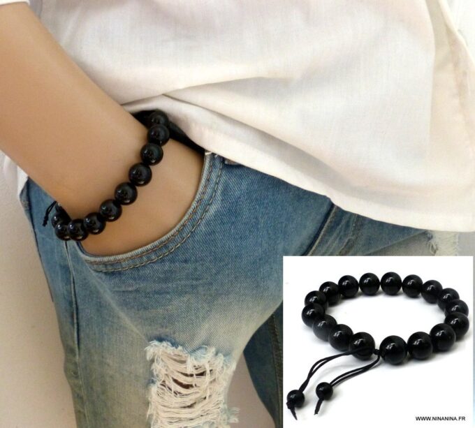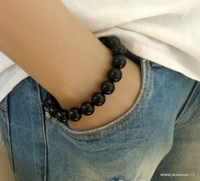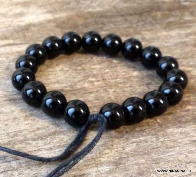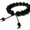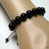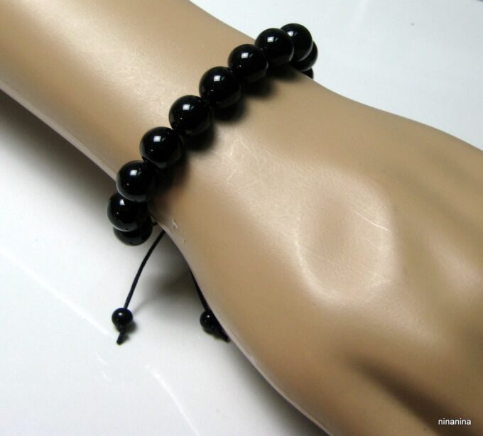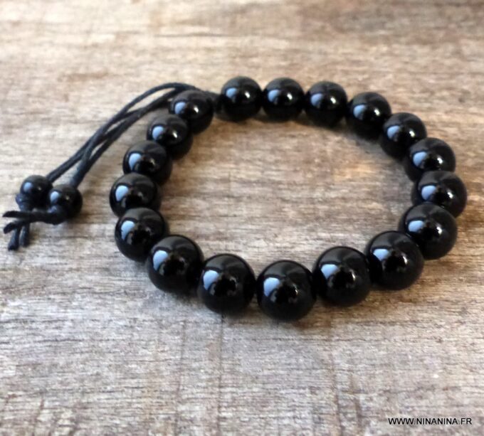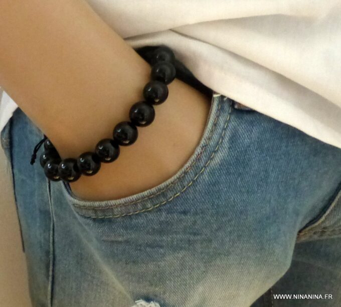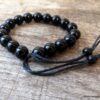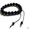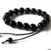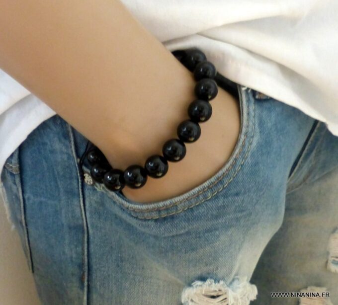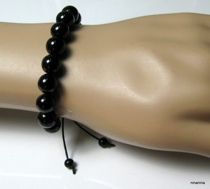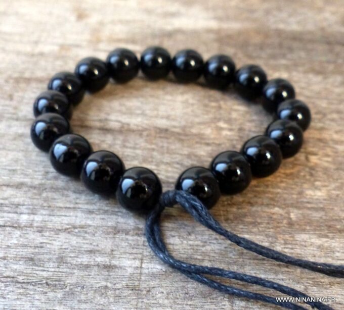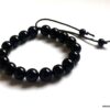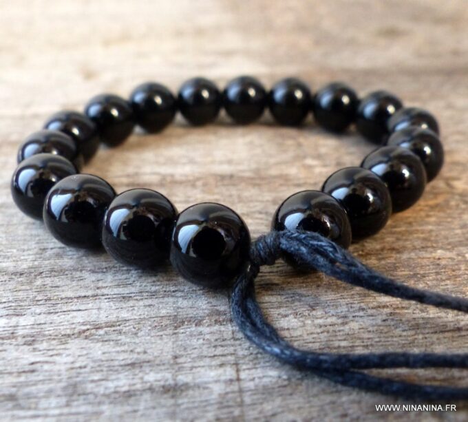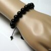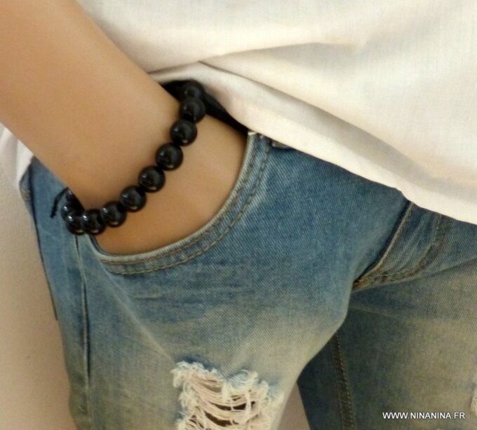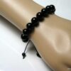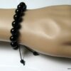 Bracelet homme réglable perles agates noires composé d’agates rondes noires montées sur un cordon de coton ciré noir (1mm de diamètre).
