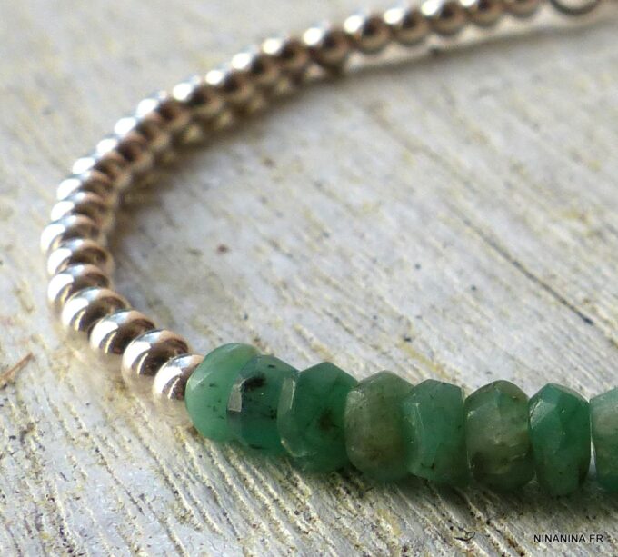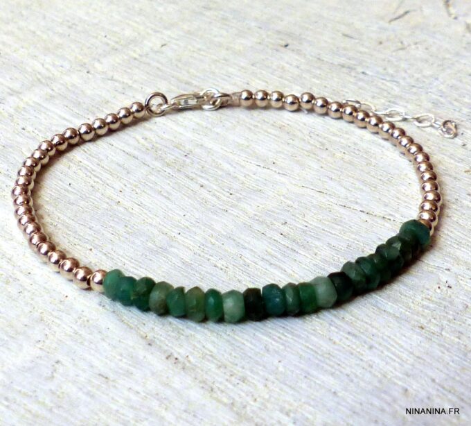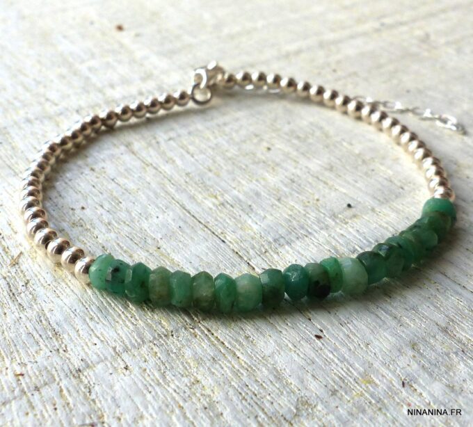 Idée cadeau Pierre de Naissance ou Anniversaire de Mariage avec ce Bracelet Perles Argent 925 massif Et Pierres Emeraudes constitué de perles rondes en Argent 925 et de Pierres en Emeraude naturel. Ce Bracelet en Argent 925 de haute qualité et de pierres de premier choix est unique et fabriqué à la main, de façon artisanale dans notre atelier en France. Il est terminé par un fermoir mousqueton et une chainette de rallongement.