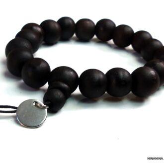Bracelet homme perle bois noir chakra argenté composé de perles rondes en bois noir et d’une breloque chakra en métal argenté montés sur un lien elastique. Diamètre des perles : 1 cm. Dim de la breloque: 1,5 X 1 cm. Diamètre : 7 cm réglable. Livré dans sa pochette d’organza.