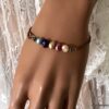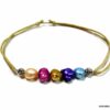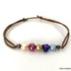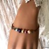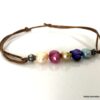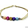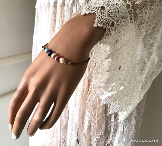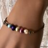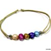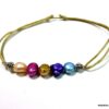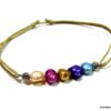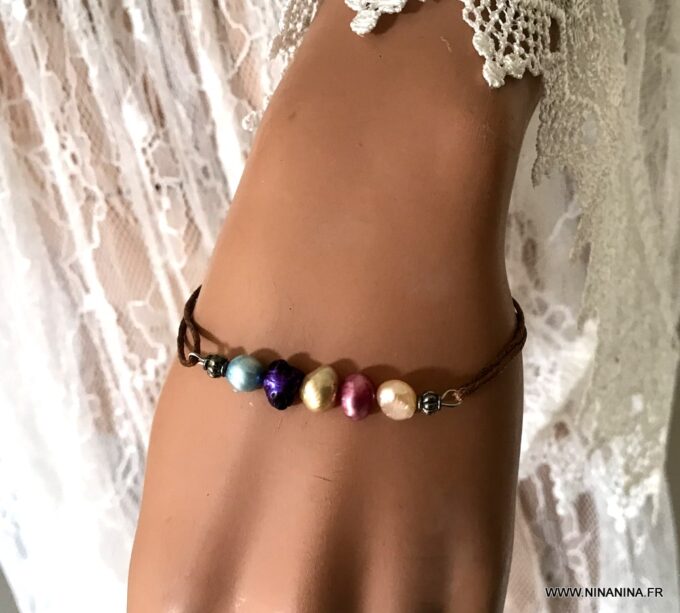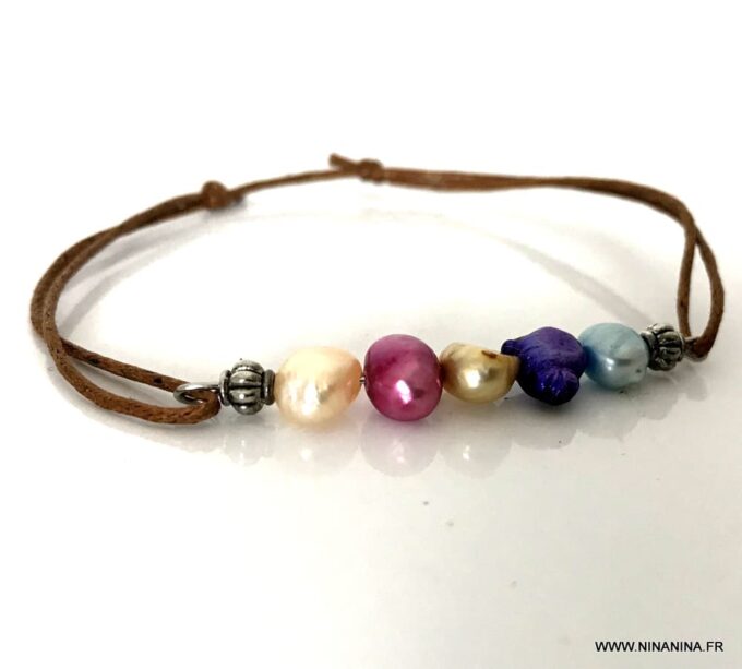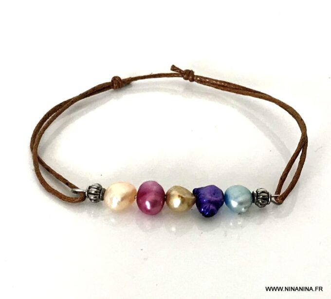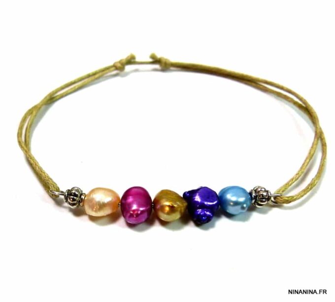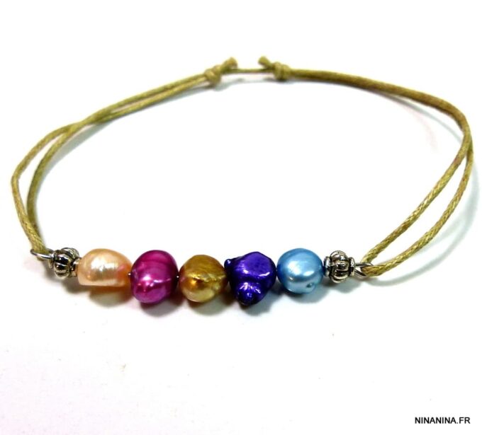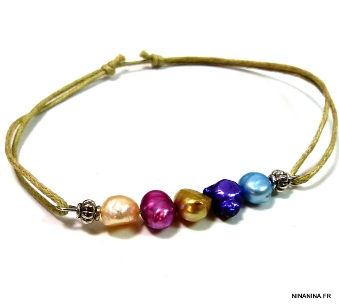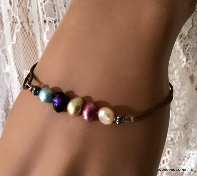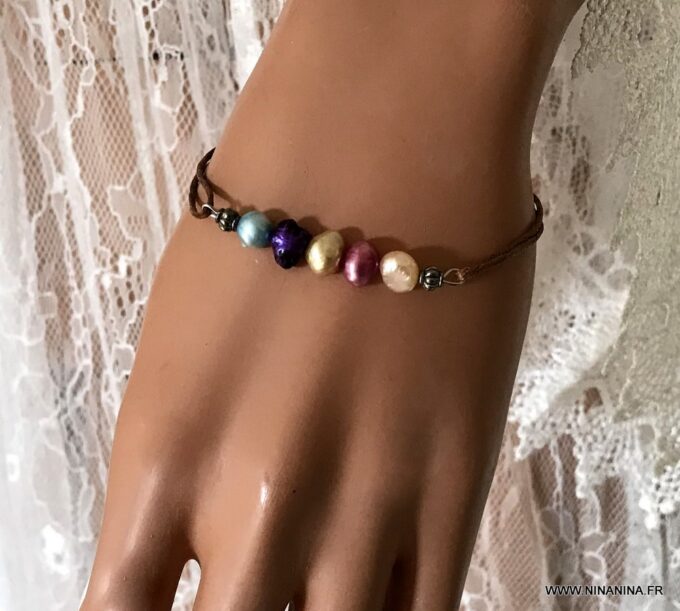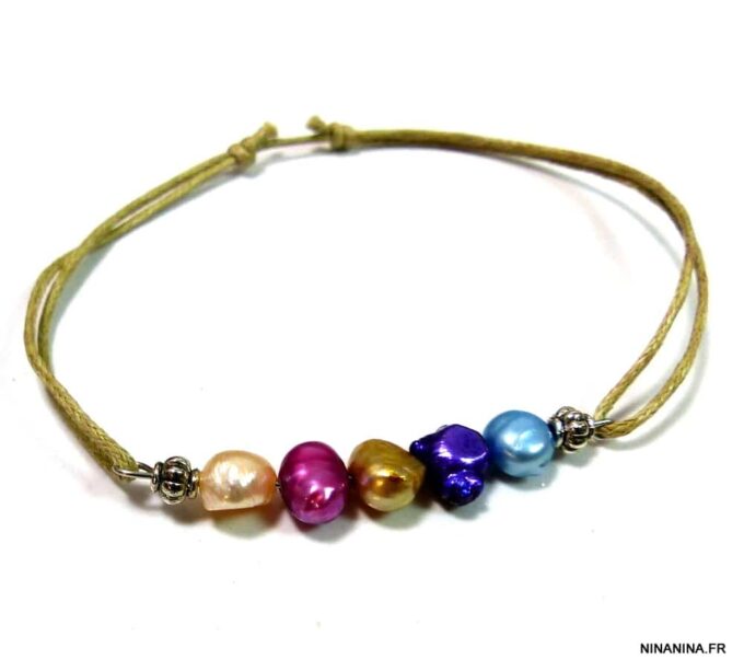 Bracelet perles d’eau douce multicolores sur cordon composé de perles d’eau douce multicolores et de perles lanterne en métal argenté montées sur un cordon de coton ciré naturel (1 mm de diamètre).