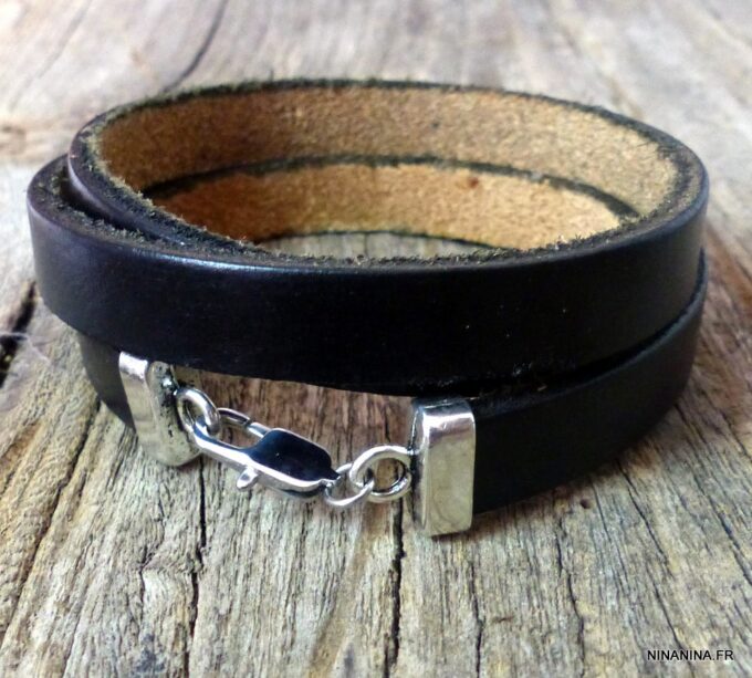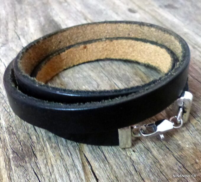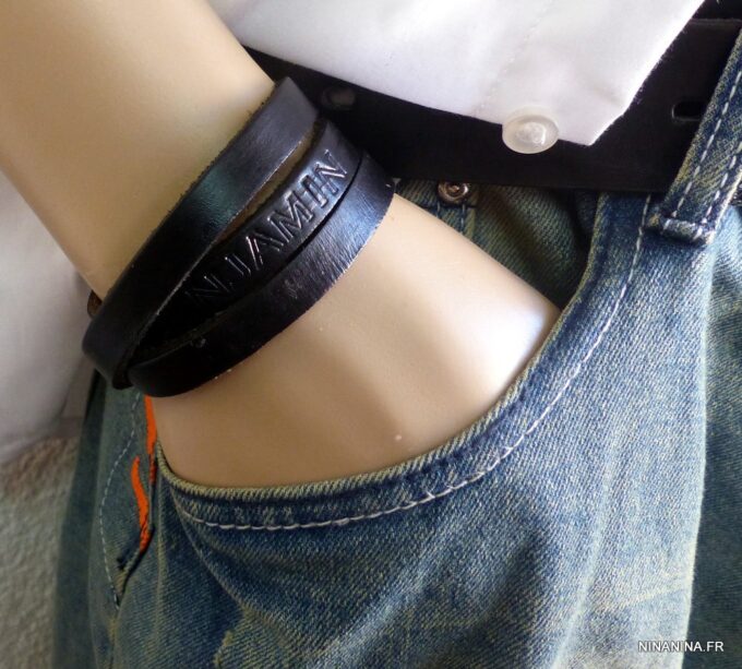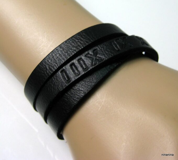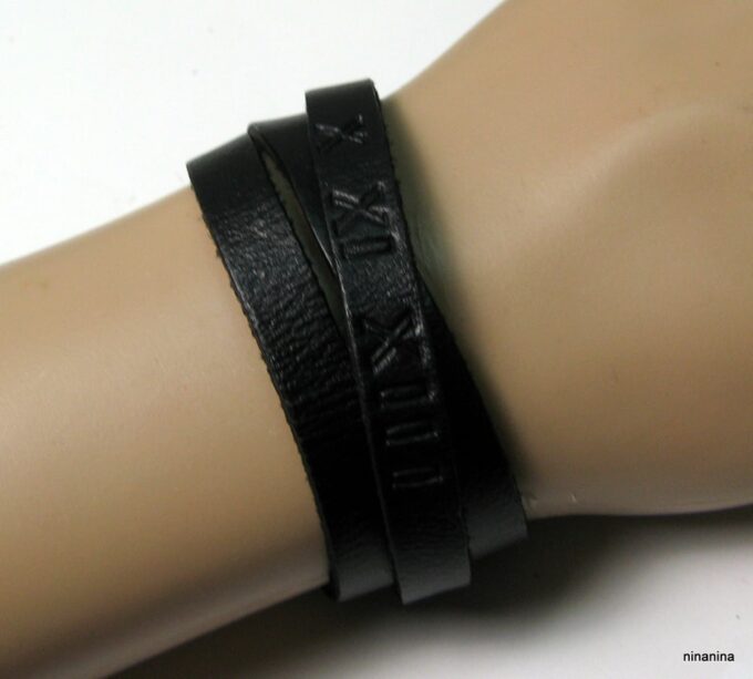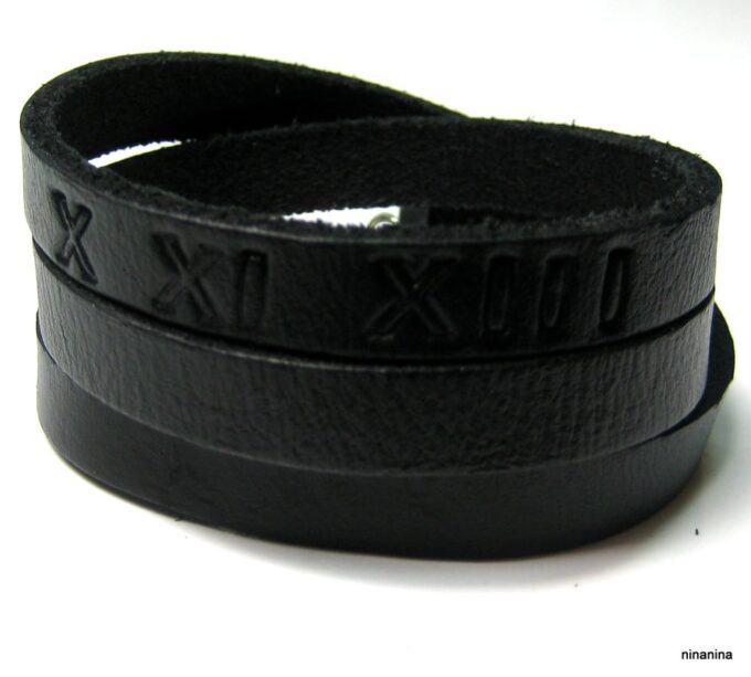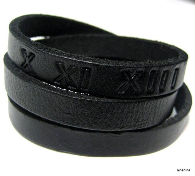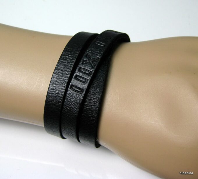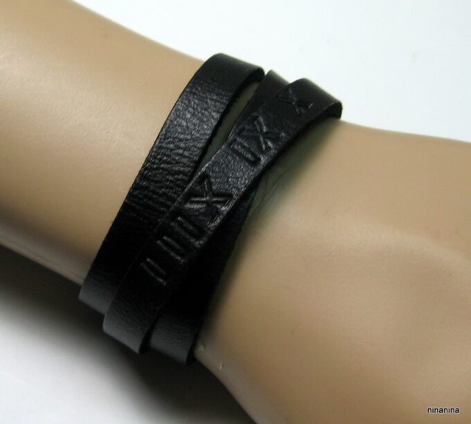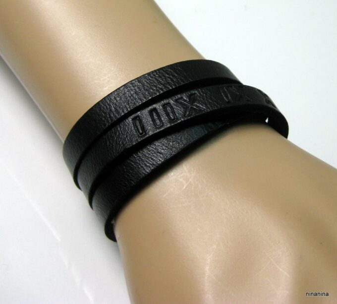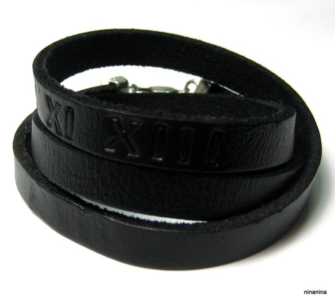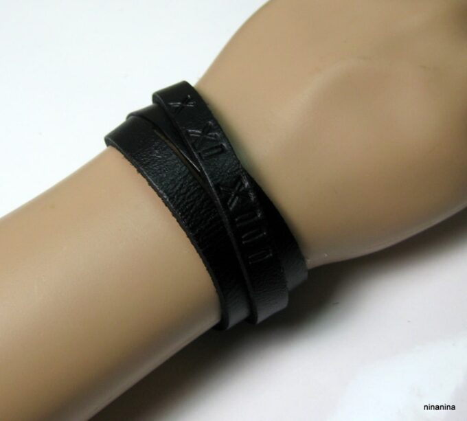 Bracelet homme cuir 3 tours personnalisé chiffres romains composé d’un bandeau de cuir noir (1 cm de large) à enrouler autour du poignet.   Fermoir mousqueton en métal argenté.