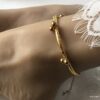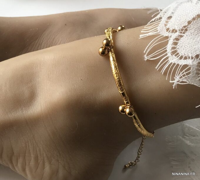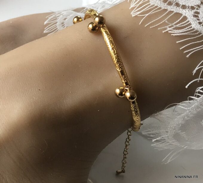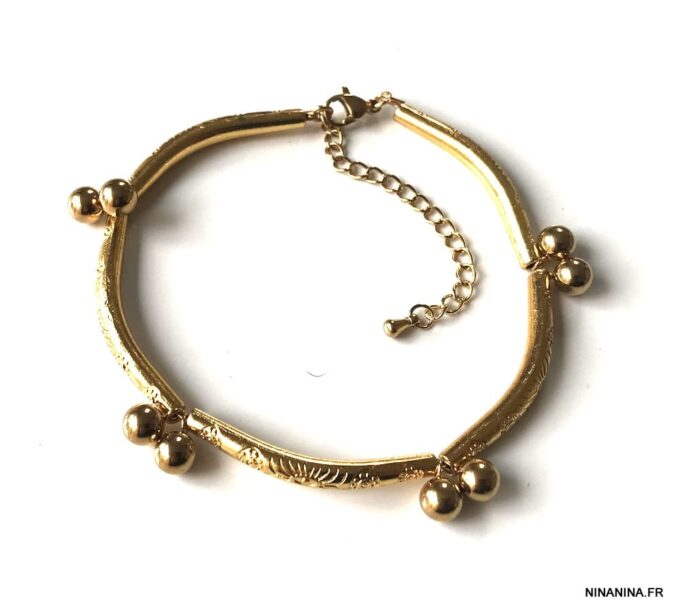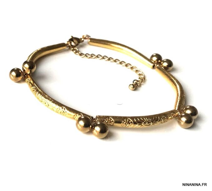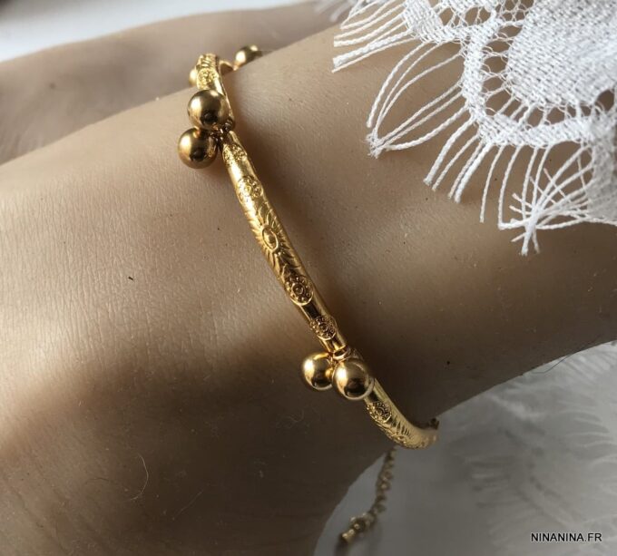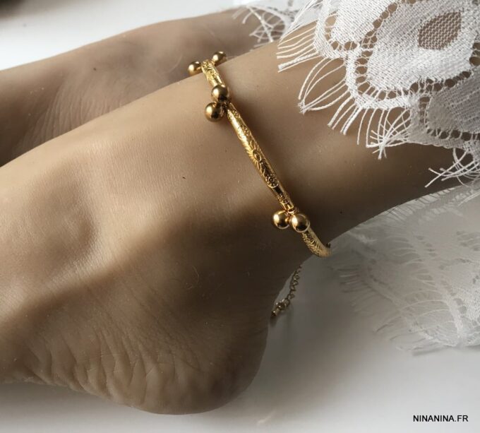 Vous allez être séduite par ce superbe Bracelet pied indien doré femme perles tube gravées constitué de Perles tubes gravées de jolis motifs floraux et de boules en acier inoxydable.