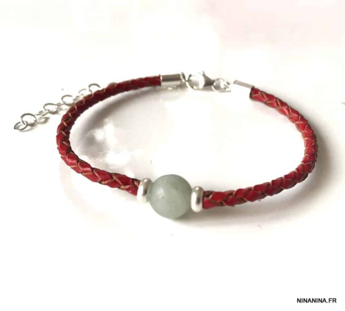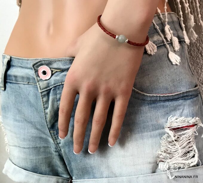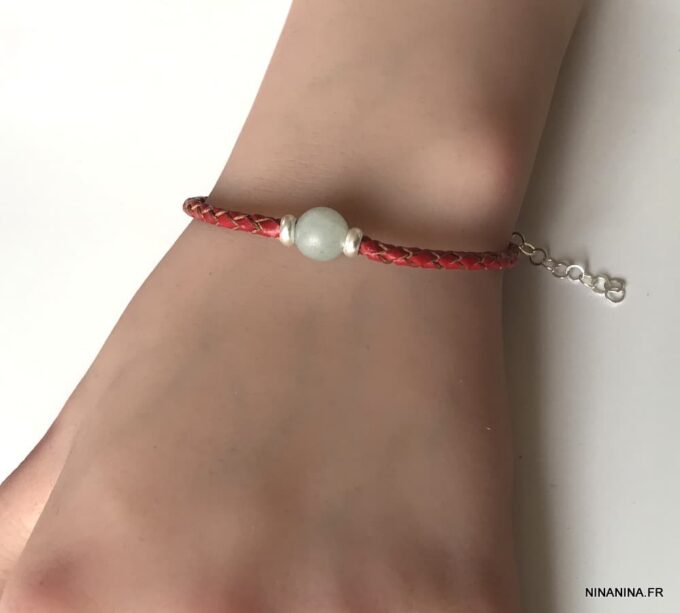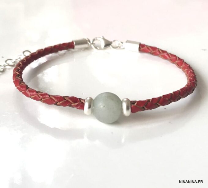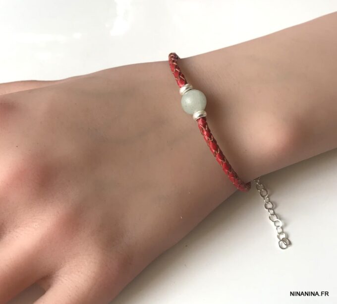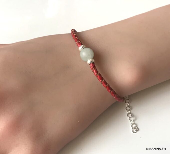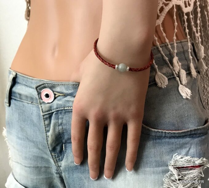 Délicatesse, finesse et originalité habilleront votre poignet avec ce Bracelet Pierre Amazonite bleue cordon cuir rouge composée d’une perle ronde de 8 mm en Amazonite bleue naturelle et de rondelles montées sur un cordon de cuir tressé rouge.