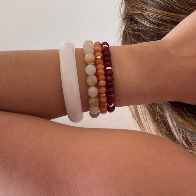 Ce Bracelet Pierre de Lune rose est le cadeau idéal pour les natifs du mois de juin, dont la Pierre de Lune est la Pierre de Naissance.  La Pierre de lune est une Pierre très calmante, apaisante, c’est un anti-stress. Elle stimule l’imagination, apporte douceur et sensibilité, développe l’intuition, l’imagination et favorise la fertilité.