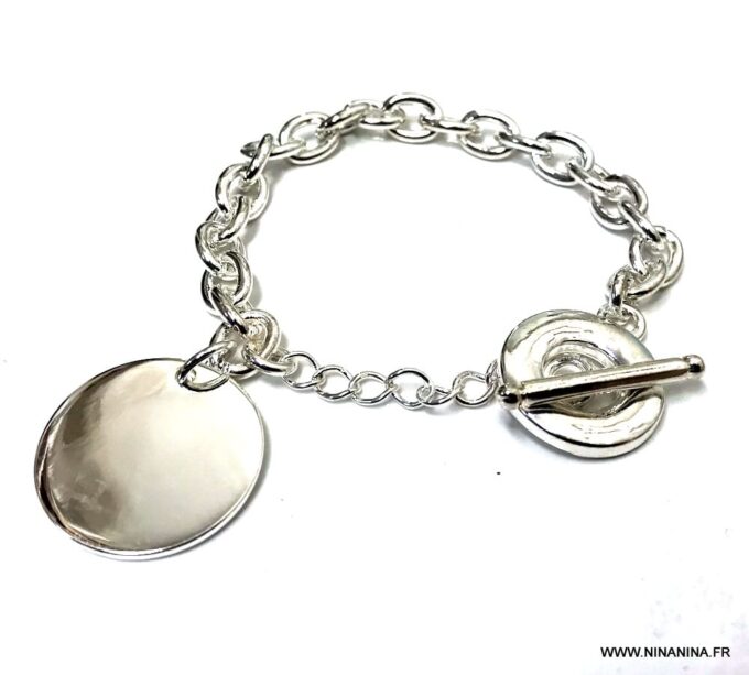 Splendide, robuste et imposant, ce Bracelet chaine gros maillon femme plaqué argent composé d’un pendentif rond monté sur chaine maillons ovales en plaqué argent. Un chainette de réglage permettra de régler le bijou à différentes longueurs.