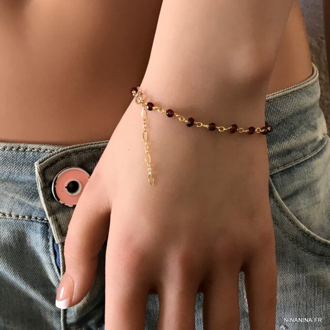 Ce Bracelet en Plaqué Or Gold filled de grande qualité est unique et fabriqué à la main, de façon artisanale dans notre atelier en France. Il est terminé par un fermoir rond à ressort. Le diamètre des pierres en grenat hydro est de 4mm.