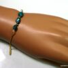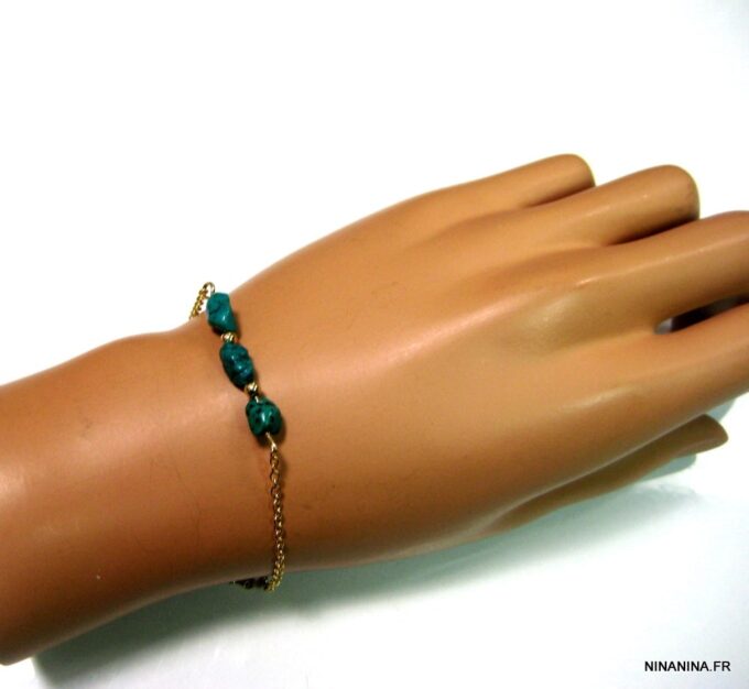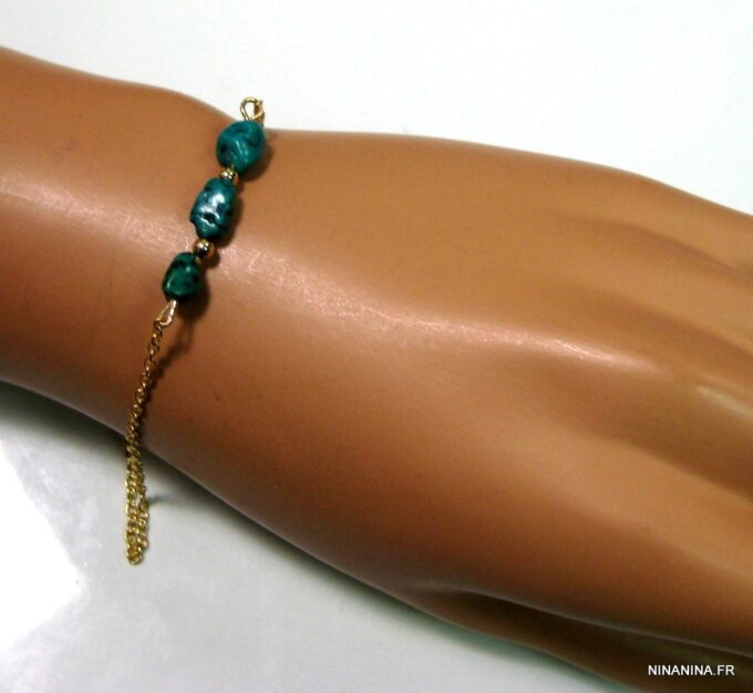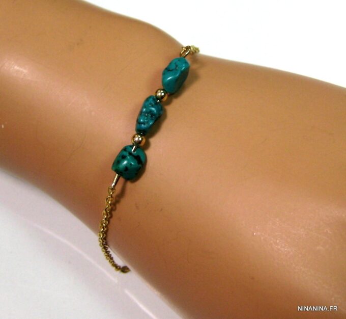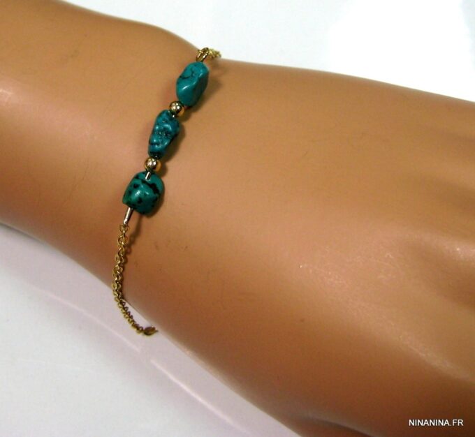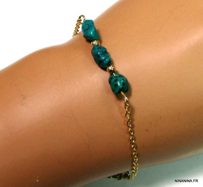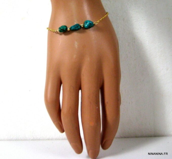 Bracelet plaqué or et turquoises composé de 3 turquoises véritables et de 2 perles rondes en plaqué or 18 carats montées sur une chainette en plaqué or 18 carats. Fermoir mousqueton. Longueur totale (fermoir compris): 20 cm env. TOUTE AUTRE LONGUEUR POSSIBLE – longueur souhaitée à indiquer en commentaire. Livré dans sa pochette d’organza. Bijou 100% fait main.
