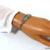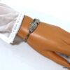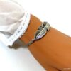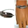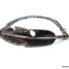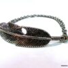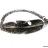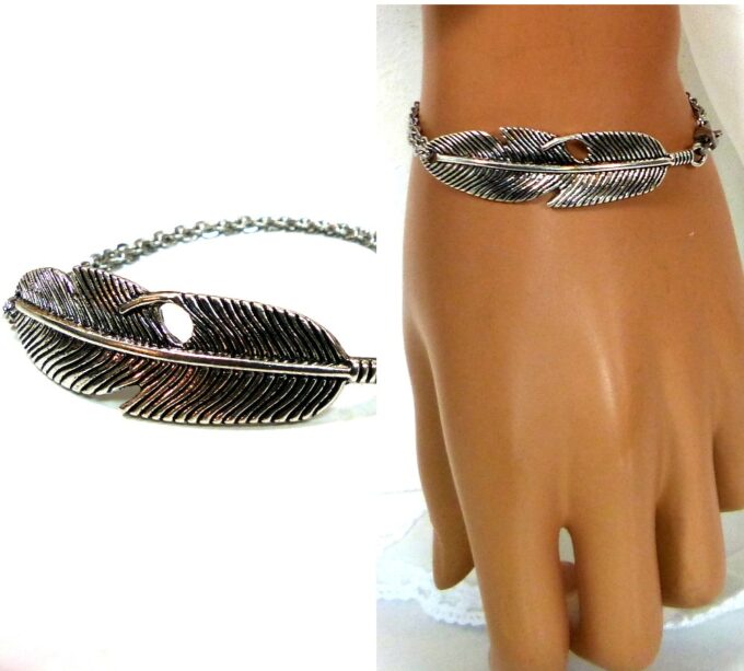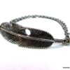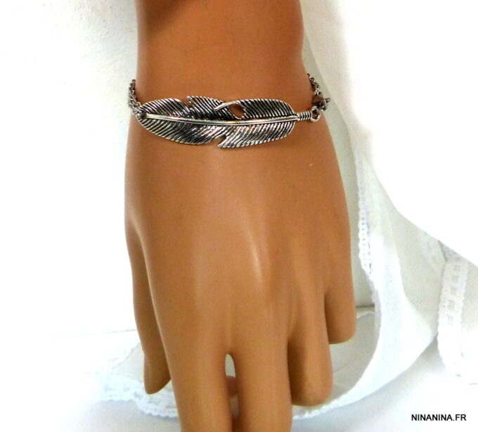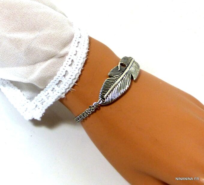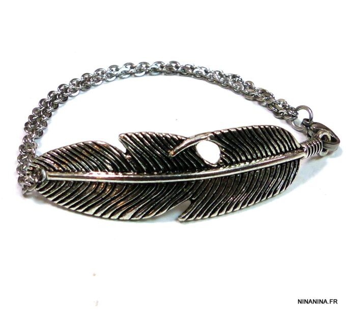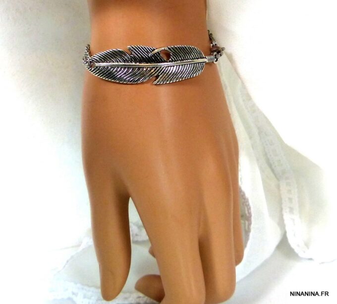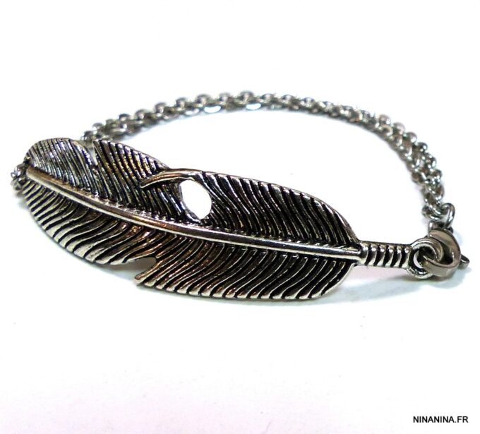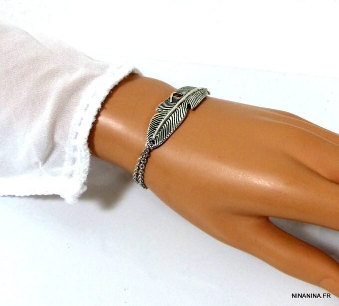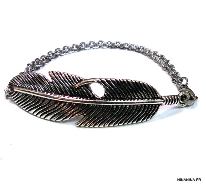 Bracelet manchette plume incurvée pour femme composé d’une plume incurvée en métal argenté montée sur une double chainette en acier inoxydable.