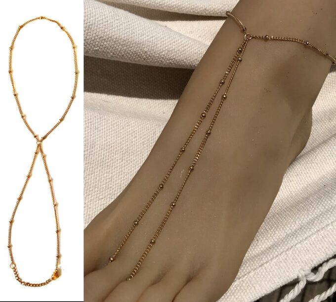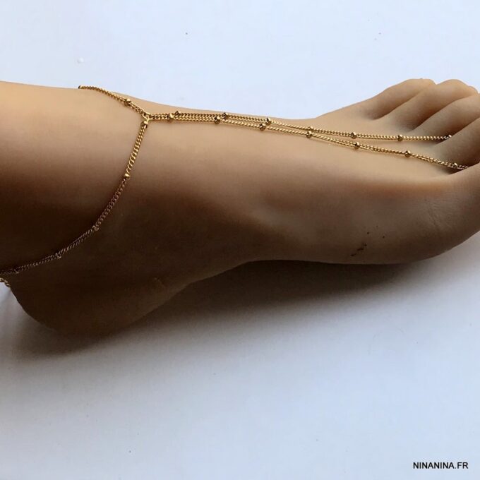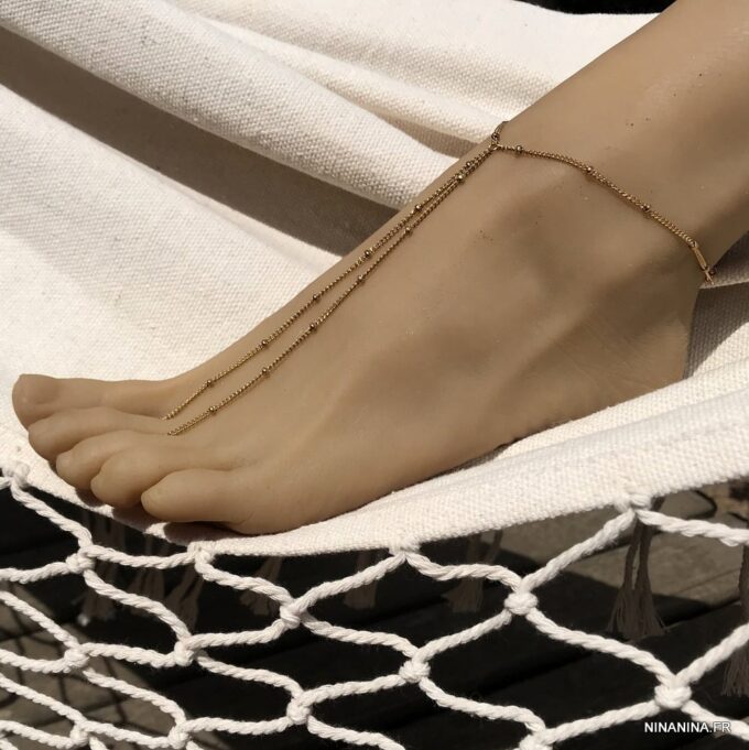 Délicat, raffiné et original, ce Bracelet pour pied femme or Acier inoxydable doré couvre le dessus du pied de la manière la plus jolie qu’il soit ! Une belle couleur dorée, une maille originale avec ses petites boules dorées, il ne lui en faut pas plus à ce bijou de pied acier chirurgical pour faire des jaloux !