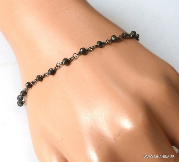 Ce Bracelet en pierres pyrite de haute qualité est unique et fabriqué à la main, de façon artisanale dans notre atelier du sud de la France. Il est terminé par un fermoir mousqueton et une chainette de rallongement réglable. Le diamètre des pierres est de 4mm. Il s’agit d’une pièce faite sur mesure qui convient pour la majorité des poignets, La longueur ajustable est de 16 cm + 5 cm de chainette de rallongement. Merci de laisser un commentaire si vous souhaitez une autre longueur. Disponible également avec des agates blanches, amethystes et emeraudes. Poids : 2g.