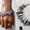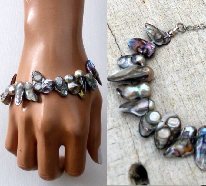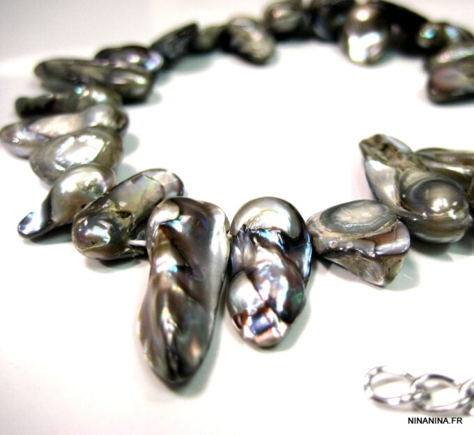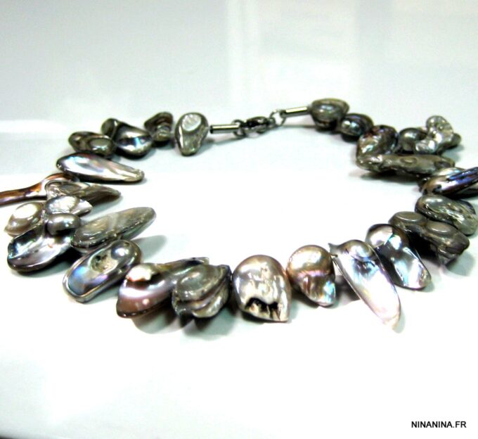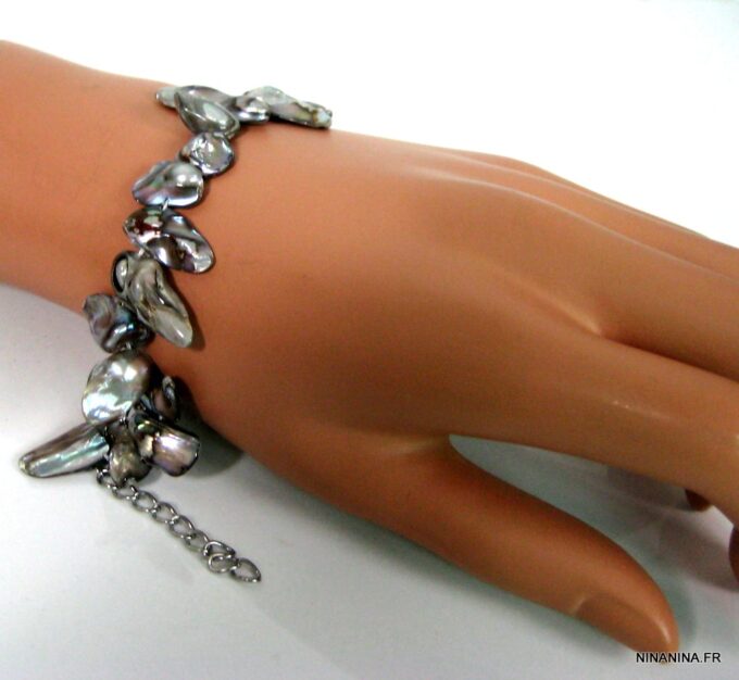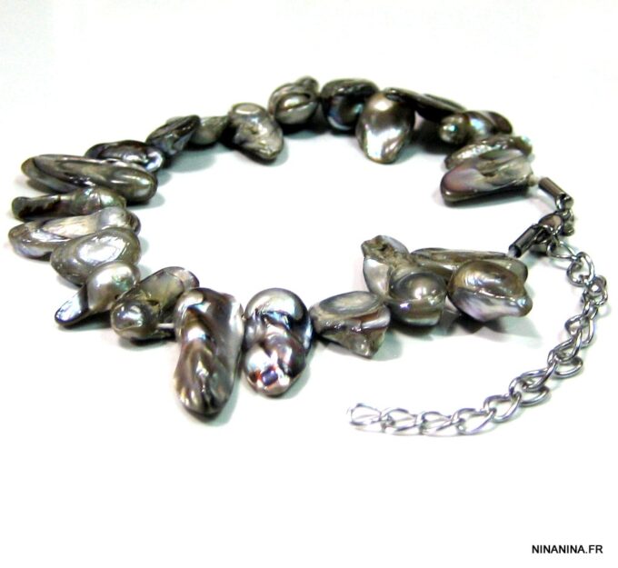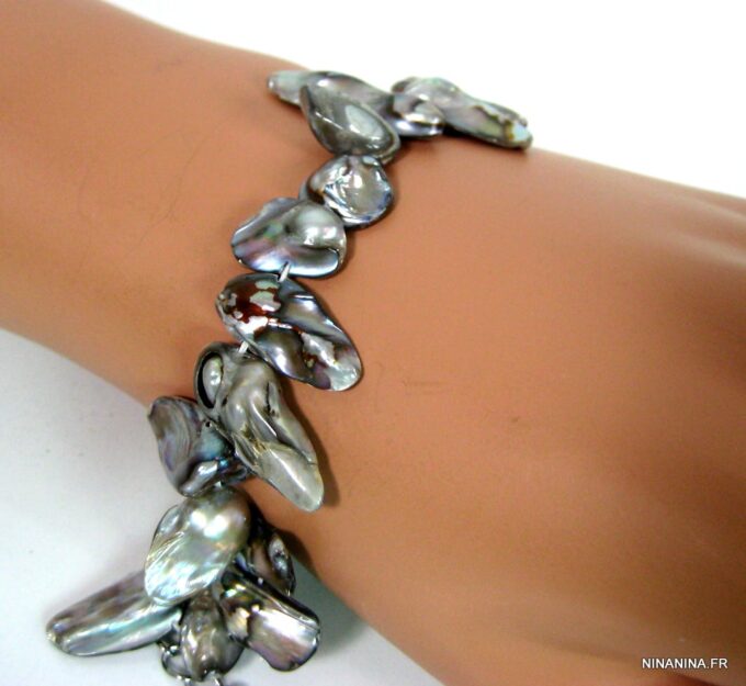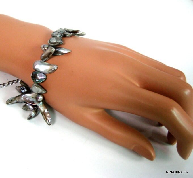 Bracelet nacre grise ships d’eau douce pour femme composé de ships de nacre grises .