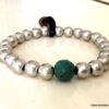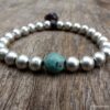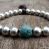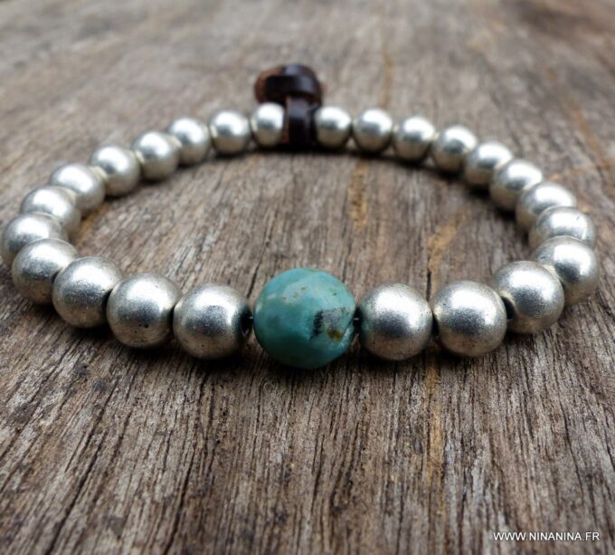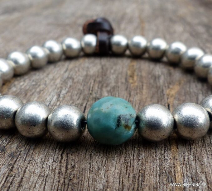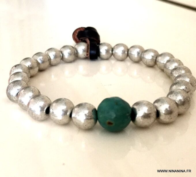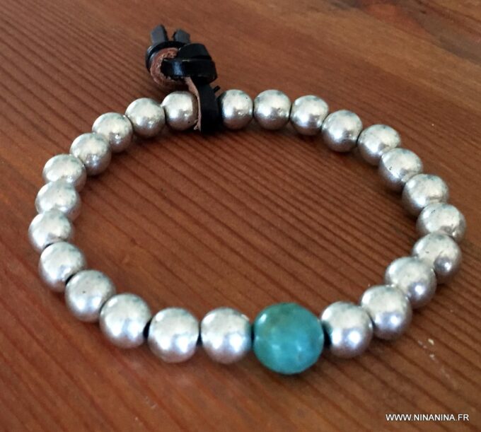 Bracelet perle turquoise naturelle fil elastique composé d’une turquoise facettée naturelle ovale et de perles rondes en métal argenté montées sur un lien elastique.