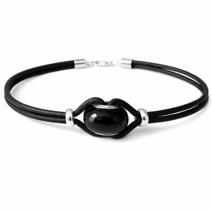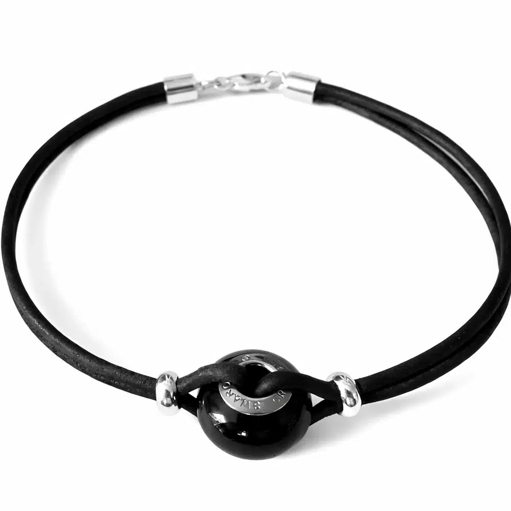Au centre de ce Bijou luxueux , une perle noire Swarovski apporte une touche de brillance raffinée. Son éclat profond et élégant contraste parfaitement avec la sobriété du cuir, créant un bijou à la fois chic et masculin. La perle capte la lumière avec finesse, sans excès, pour un rendu équilibré et moderne.