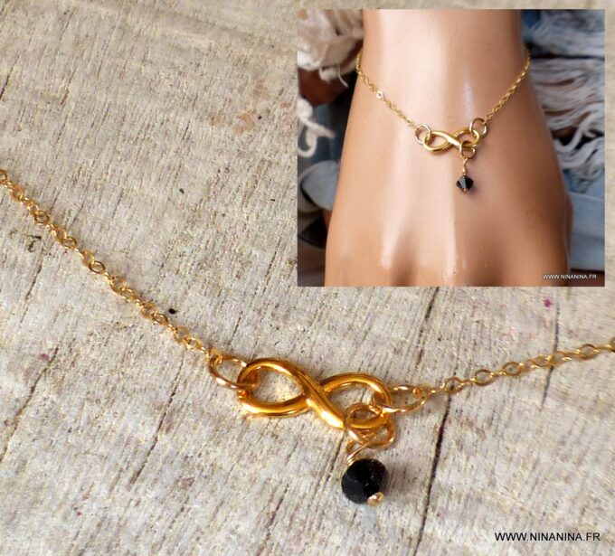 Découvrez ce magnifique Bracelet infinity Swarovski perles noires plaqué or 24 carats constitué d’une perle noire en cristal de swarovski véritable et d’un symbole infini en vermeil (argent 925 doré à l’or fin 24 carats) montées sur une Chaine en Plaqué Or 24 carats.