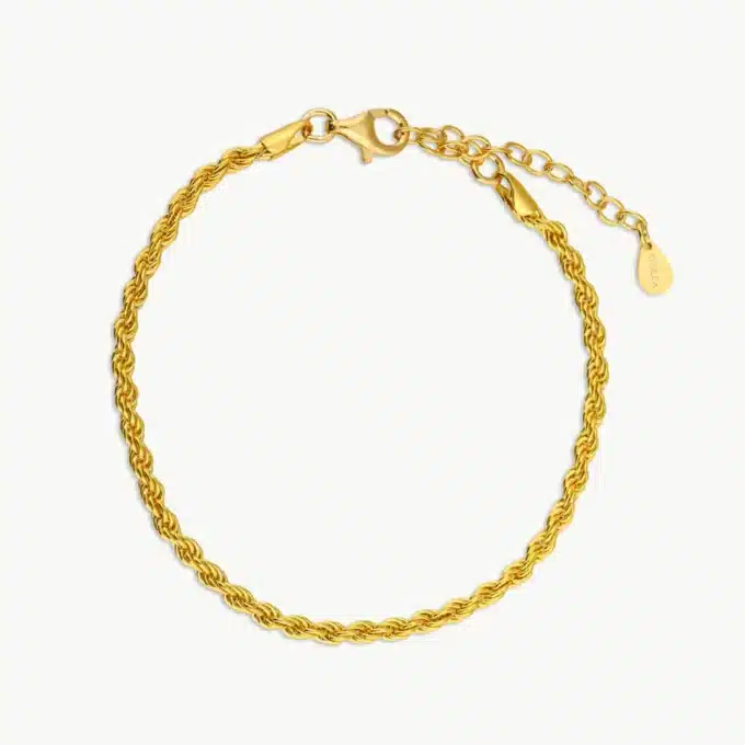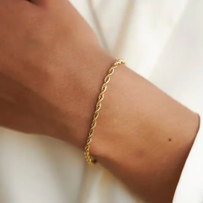 Ce bracelet délicatement torsadé en acier inoxydable doré séduit par sa finesse et son éclat subtil. Élégant et indémodable, ce bracelet maille corde se porte facilement au quotidien comme en soirée.