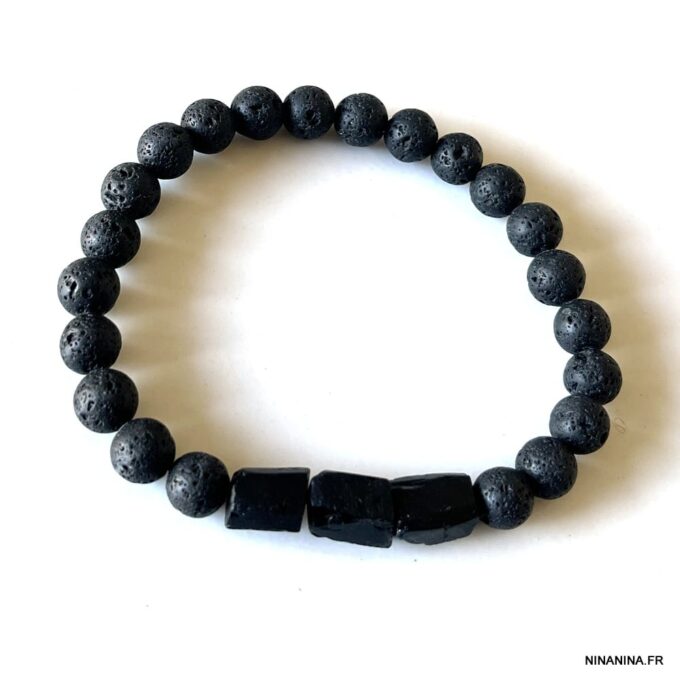Trois pierre cylindrique brutes en Tourmaline noire et des boules en pierre de lave de 8mm composent ce bracelet très tendance qui apportera à votre style et votre tenue une certaine assurance !