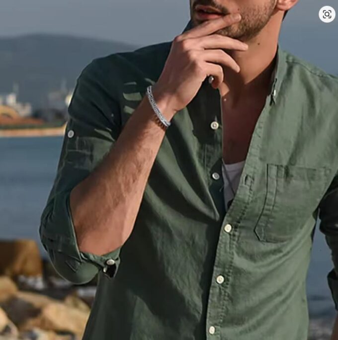 Style habillé : associé à une chemise et une montre en acier, pour un ensemble élégant.