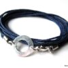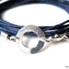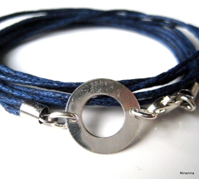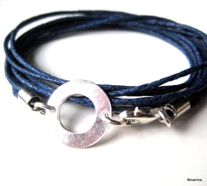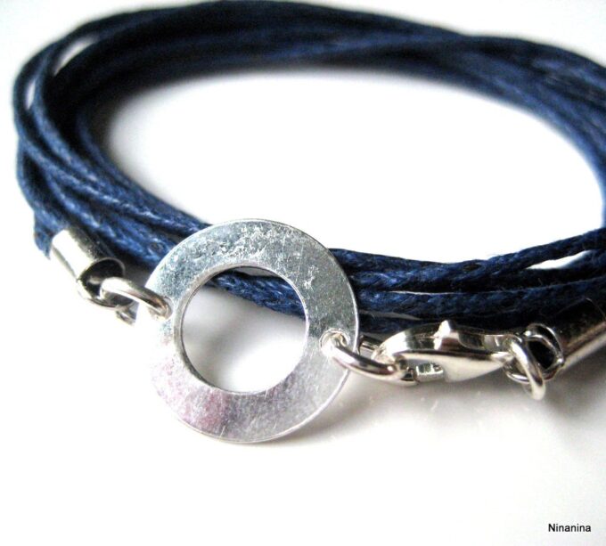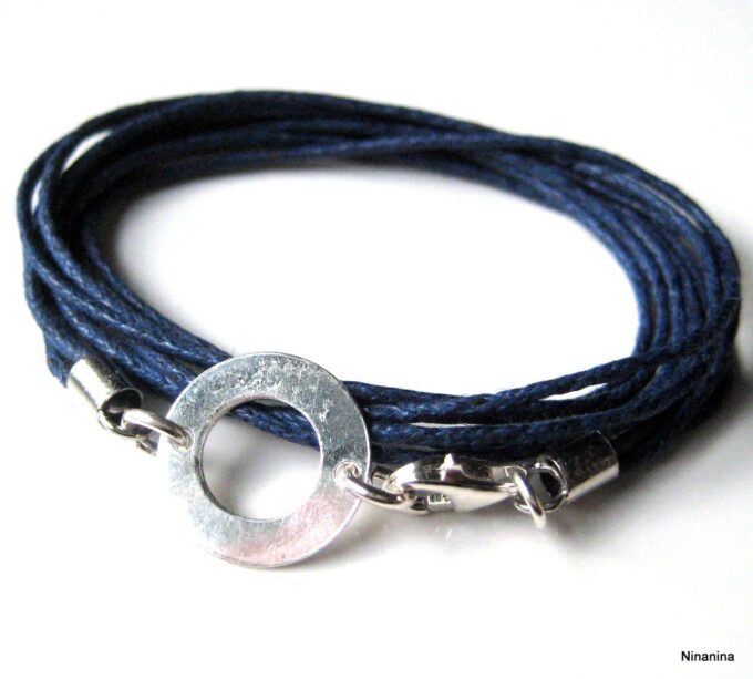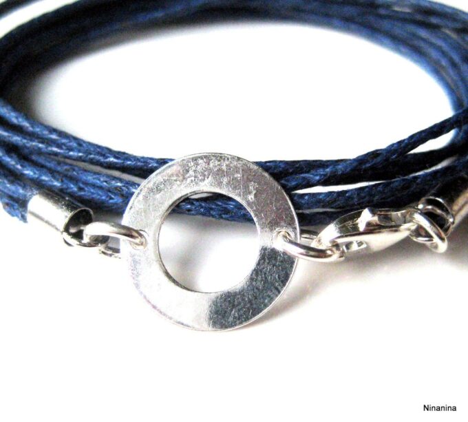 Bracelet 3 tours argent massif composé d’une cible ronde en argent 925 monté sur un triple cordon de coton ciré bleu nuit (1mm de diamètre). Diamètre de la cible : 1,3 cm. Longueur totale (fermoir compris) : 56 cm env. Fermoir mousqueton. Livré dans sa pochette d’organza. Bijou 100% fait-main. Poids : 1g