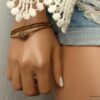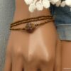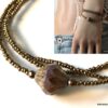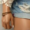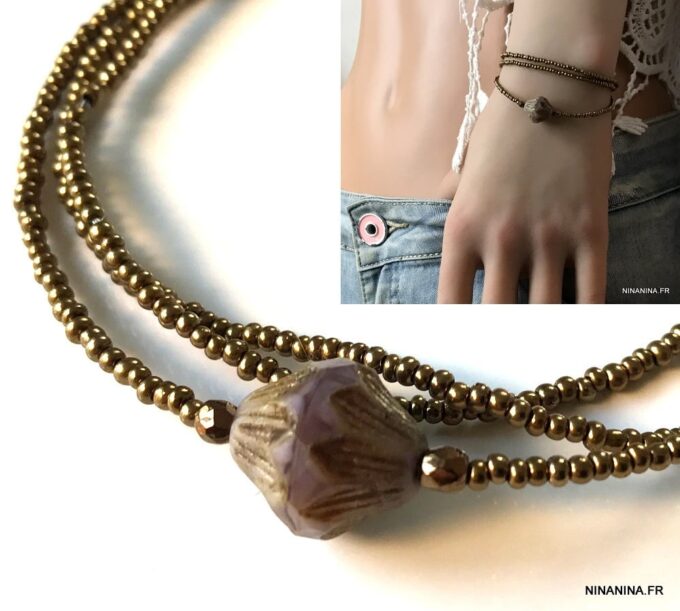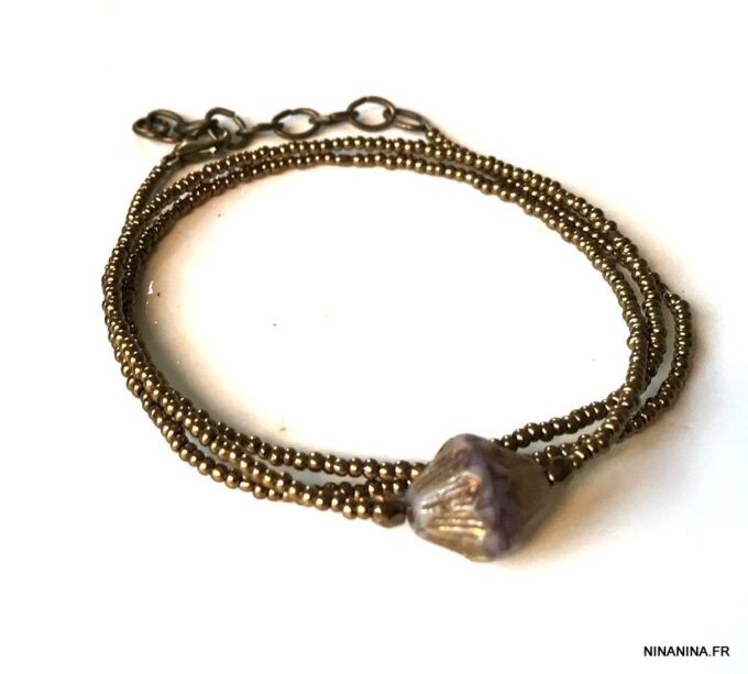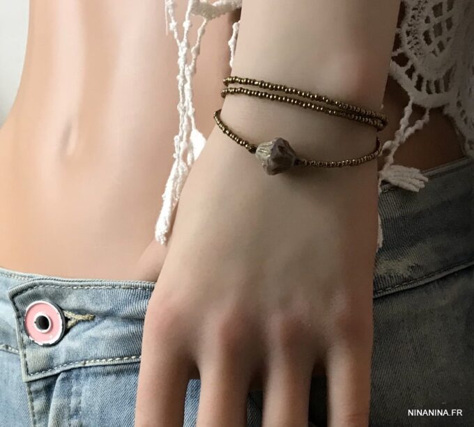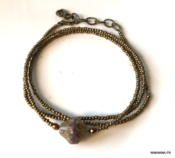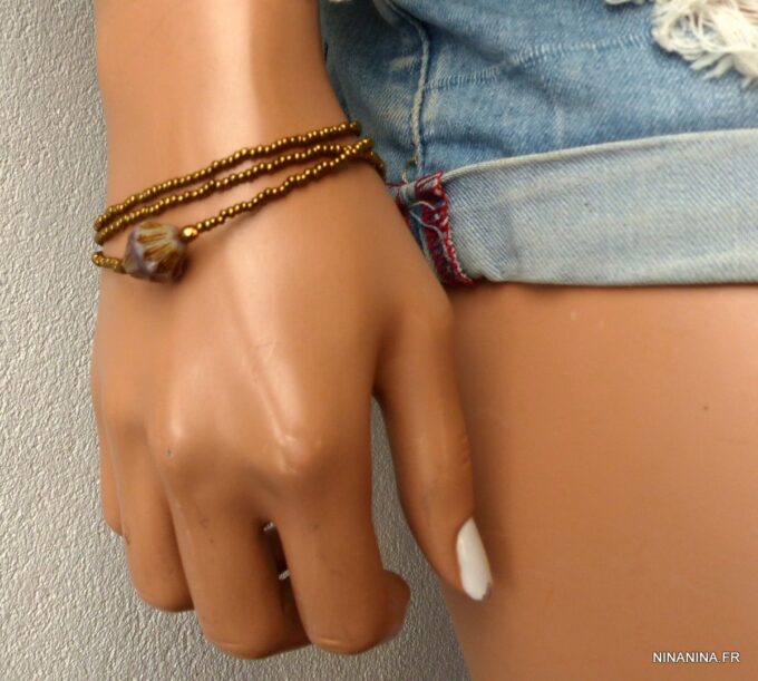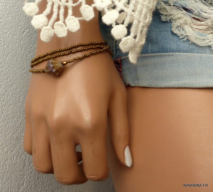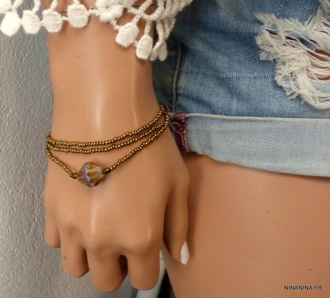 Esprit Gipsy chic pour ce Bracelet bohème chic perle picasso Et Rocailles bronze constitué de d’une grosse perle picasso bicone mauve et de rocailles bronze montées sur un fil de nylon, à enrouler autour du poignet. Ce Bracelet Fantaisie 3 tours de haute qualité est unique et fabriqué à la main, de façon artisanale dans notre atelier en France. Il est terminé par un fermoir mousqueton en métal bronze et une chainette de réglage pour un ajustement parfait.