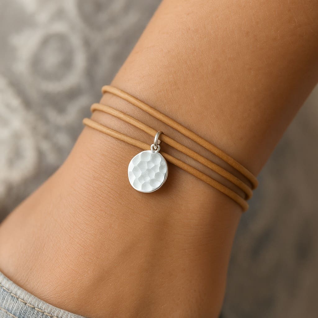 Épure et caractère se rencontrent dans ce bracelet artisanal plusieurs tours en cuir naturel. Son design sobre et élégant met en valeur une médaille ronde en argent 925 martelé, façonnée à la main pour un effet de texture unique qui capte la lumière.