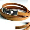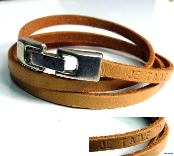 Bracelet wrap cuir personnalisé JE T’AIME PAPA composé d’une lanière de cuir naturel montée sur un fermoir en métal argenté. A personnaliser avec un mot, un titre, une date ou un prénom de votre choix. Largeur de la lanière : 5 mm. Existe aussi en cuir noir, marron chocolat ou turquoise. Longueur (fermoir compris) : 59 cm (homme) et 54 cm (femme). Livré dans sa pochette d’organza. Bijou 100% fait-main