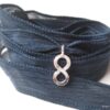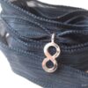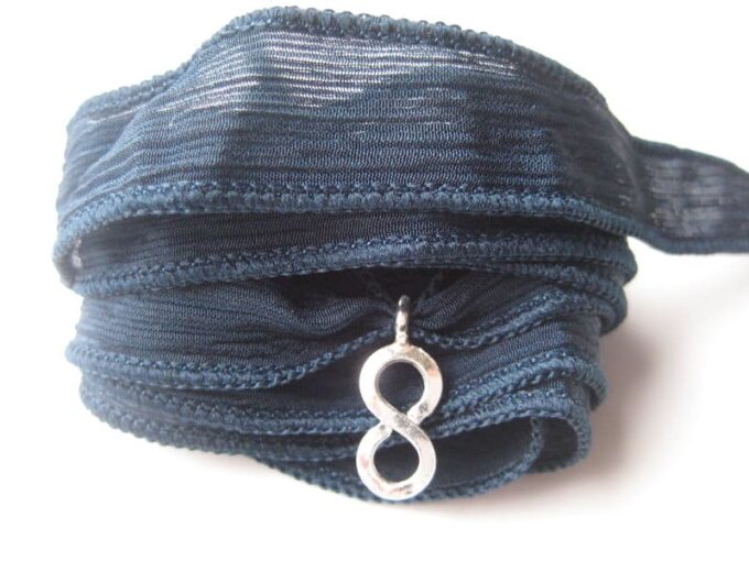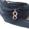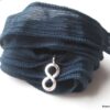 Bracelet femme signe infini wrap soie lavée Argent 925 massif composé d’un pendentif infini en argent 925 monté sur un galon de soie lavée bleu nuit (1,5 cm de large) à nouer autour du poignet.