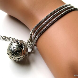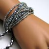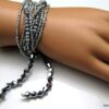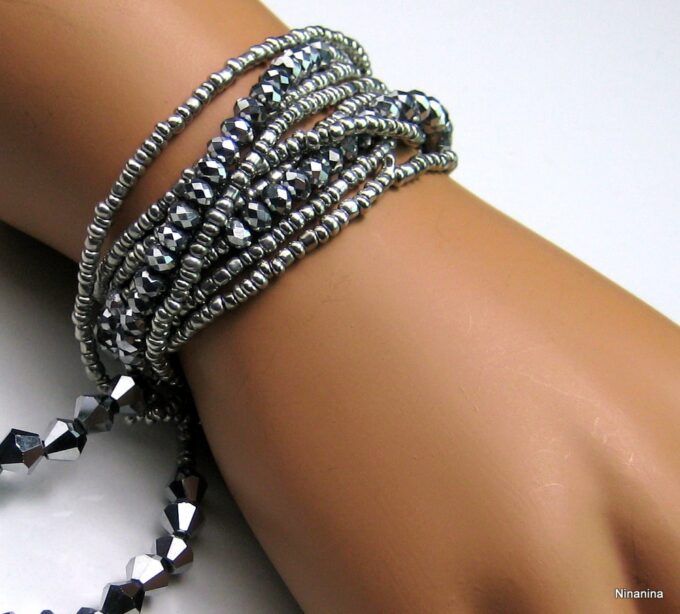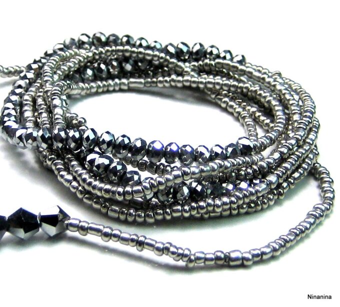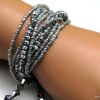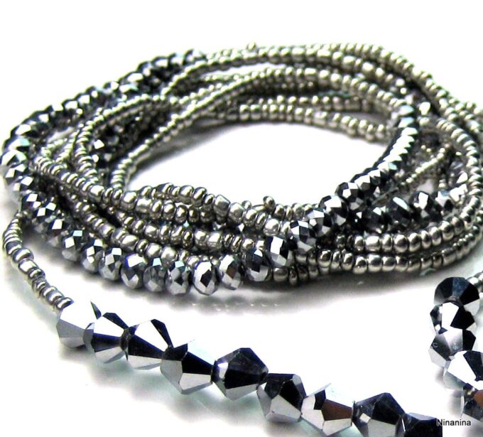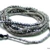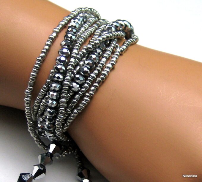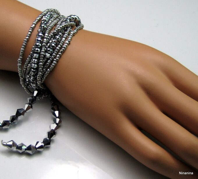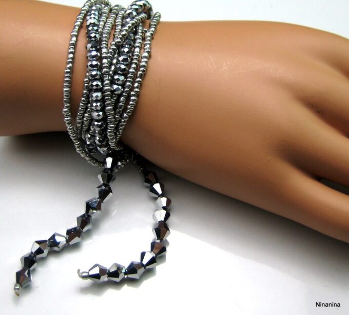 Bracelet wrap perles de rocaille composé de perles de rocailles et de perles bicones grises à enrouler autour du poignet. Existe aussi en blanc. Longueur totale : 145 cm. Fermeture par un n?ud pendant. Livré dans sa pochette d’organza.