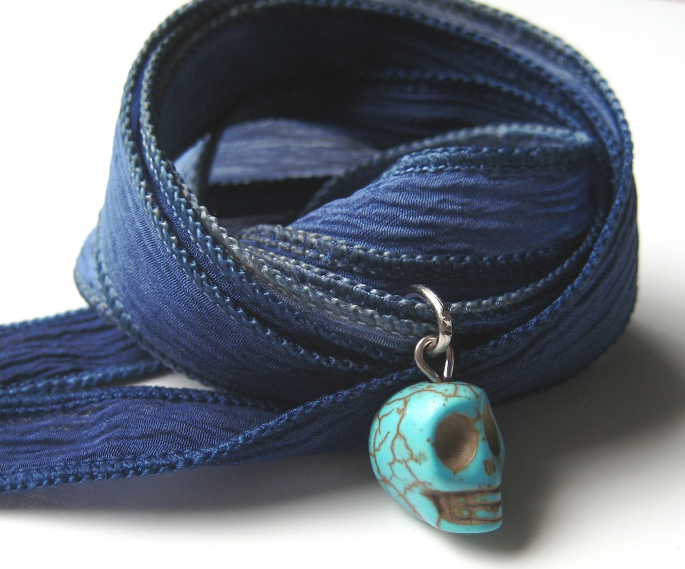 UGS : N2462Magnifique Bracelet en soie lavée breloque tête de mort turquoise composé d’un pendentif tête de mort turquoise monté sur un galon de soie lavée surpiqué bleu « jean » (1,5 cm de large) à nouer autour du poignet. Ce bijou féminin de haute qualité est unique et fabriqué à la main, de façon artisanale dans notre atelier en France.