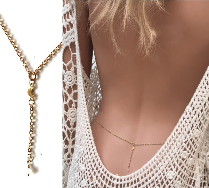 Ajoutez une touche de sensualité à n’importe quelle tenue avec cette Chaine autour du ventre plaqué or et pierre de lune constituée d’un croissant de lune en plaqué or et d’une petite perle ronde en pierre de lune véritable montées sur une Chaîne en plaqué or maille forçat.