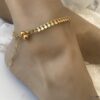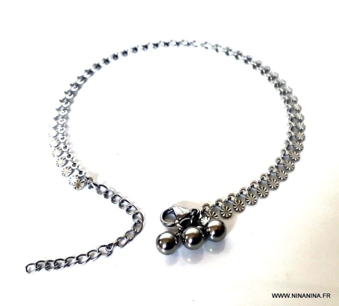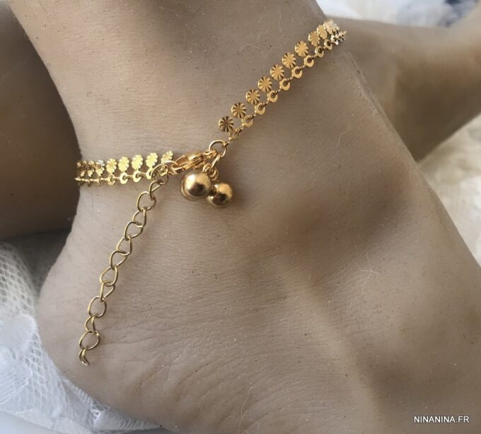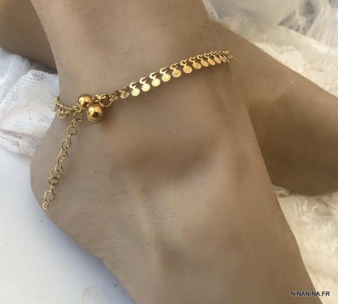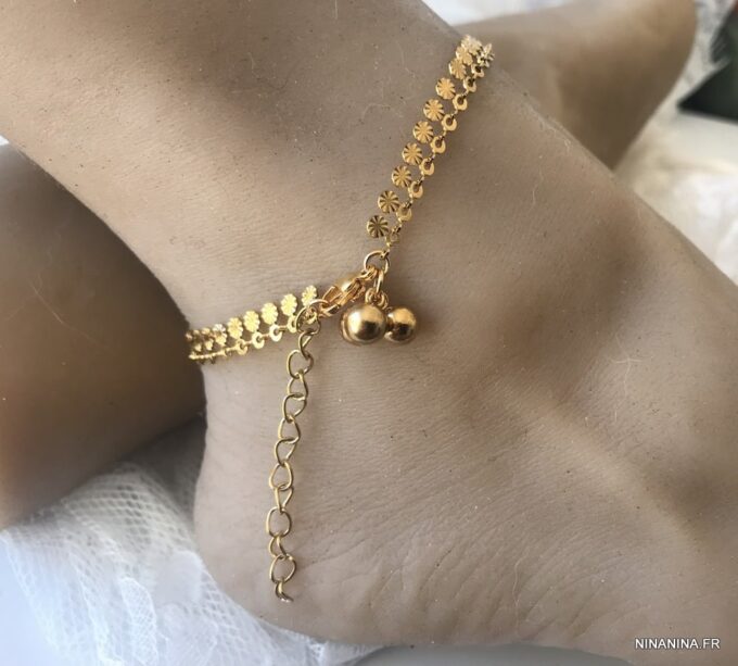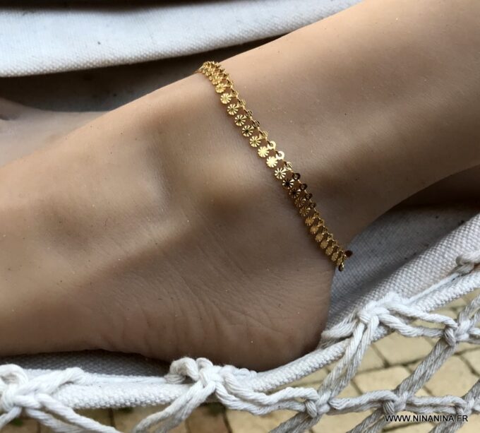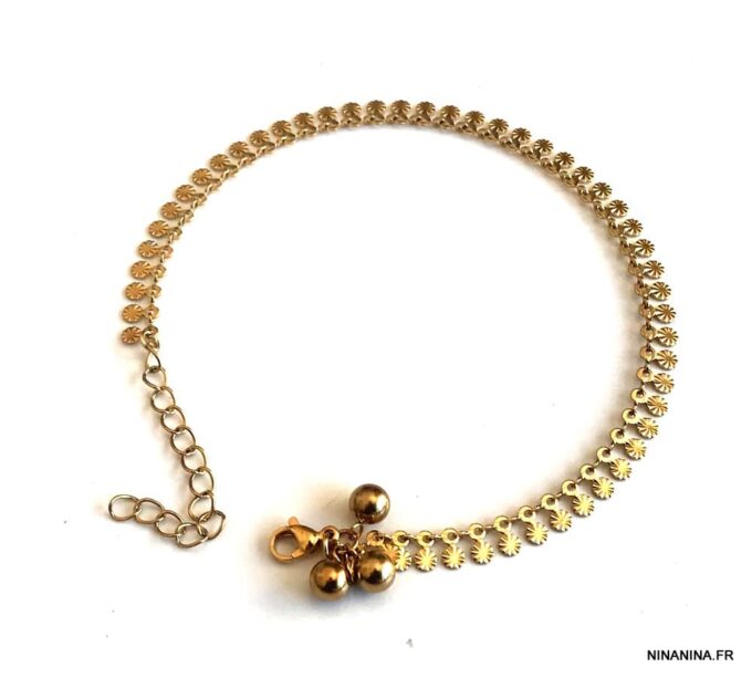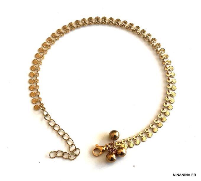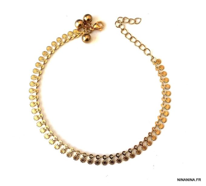 Avec ses multiples pastilles d’or gravées d’un motif fleur et ses 3 petites boules en acier inoxydable doré, ce Bracelet de cheville doré ne manquera pas de se faire remarquer ! Il est terminé par un fermoir mousqueton, sûr et facile d’utilisation. Côté pratique, la chaînette d’ajustement en argent lui autorisera d’être enfilée aussi aisément sur des chevilles toutes fines que sur des chevilles plus larges, puisqu’elle offre des possibilités d’ajustement allant de 22 à 26 centimètres.