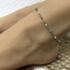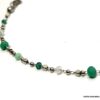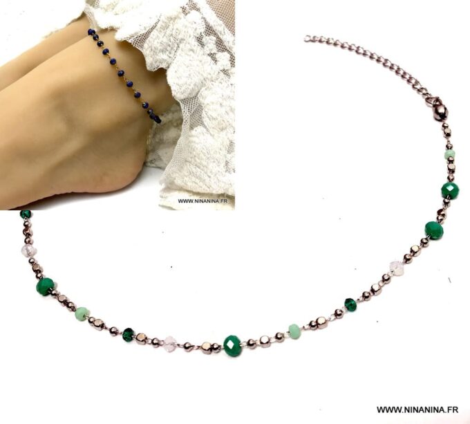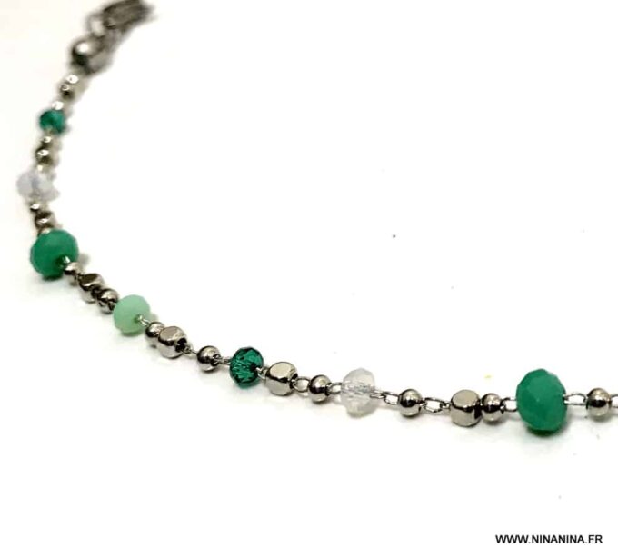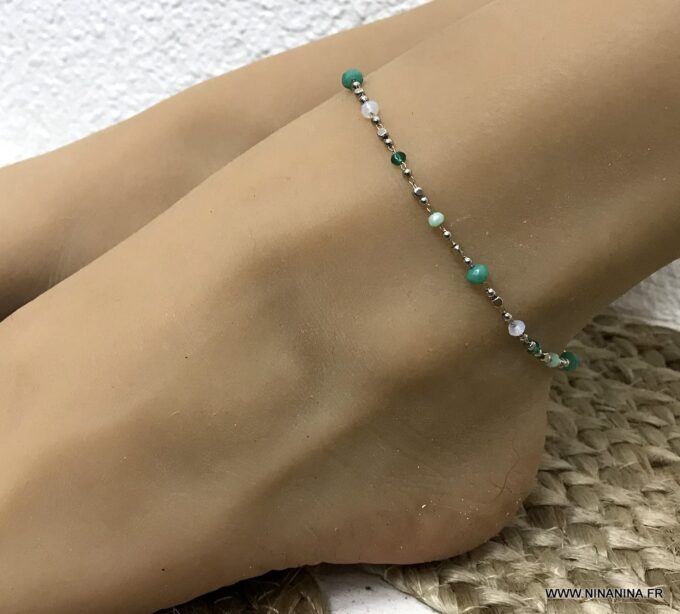 Finesse, raffinement et élégance sont les maitres mots de cette jolie Chaine cheville perle verte femme acier inoxydable argent constituée de perles rondes et carrées en acier inoxydable argent et de perles vertes de différentes nuances en verre, terminé par un délicat fermoir mousqueton, sûr et facile d’utilisation.