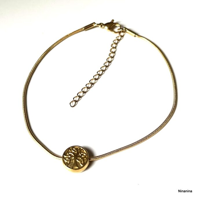 Le médaillon Arbre de Vie est monté en coulisse sur la chaîne, ce qui permet de le déplacer facilement et de le positionner exactement où vous le souhaitez. Un détail ingénieux qui offre une liberté totale : centré sur la cheville, légèrement décalé, ou porté plus haut selon votre style et votre confort.