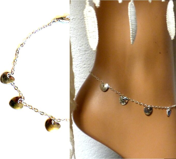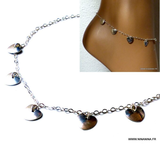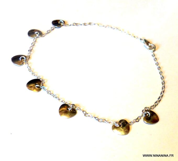 Bracelet cheville coeur breloques Argent 925 massif composé de breloques coeurs montées sur une chainette en argent 925.