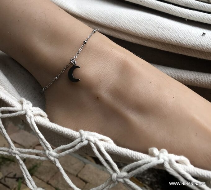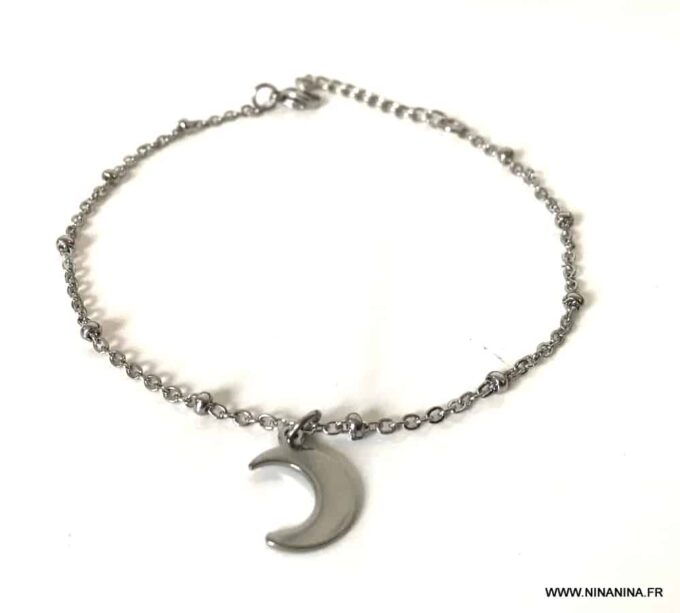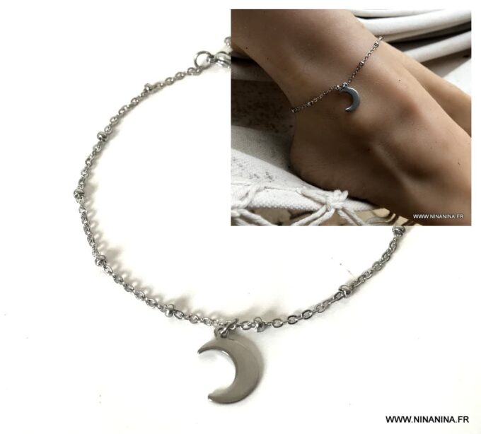 Habillez joliment votre pied avec ce joli Bracelet de cheville tendance croissant de lune Acier argent constitué d’une breloque croissant de lune montée sur une chaine maille satellite en Acier inoxydable argent.