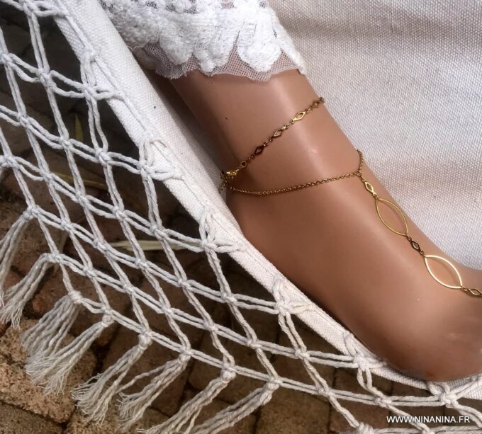 Ce joli Bijou de pied en Acier doré de grande qualité est unique et fabriqué à la main, de façon artisanale dans notre atelier en France. Il est terminé par un délicat fermoir mousqueton facile d’utilisation. Il s’agit d’une pièce faite sur mesure, en série limitée, qui convient pour la majorité des chevilles, la longueur est de 25 cm (20 cm de chaine + 5 cm de chainette de rallongement).