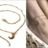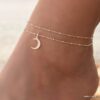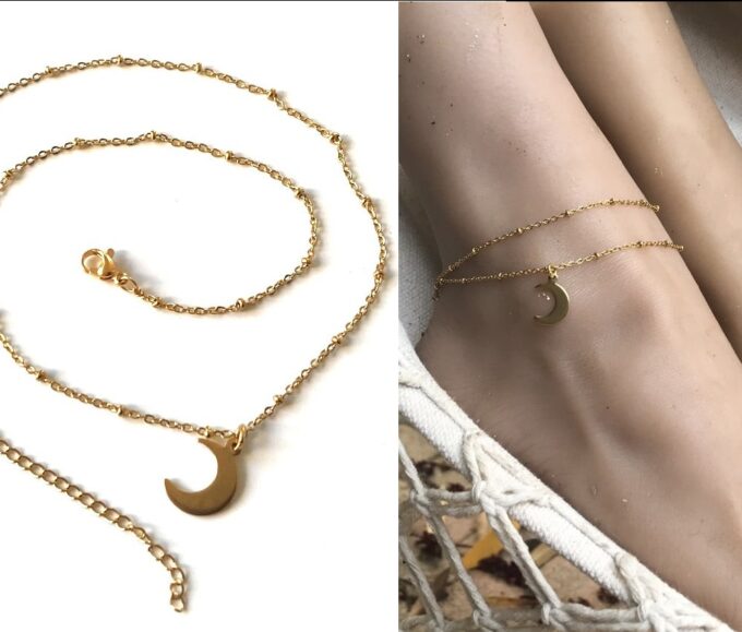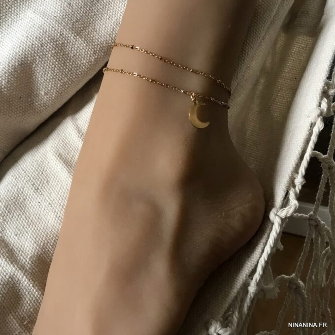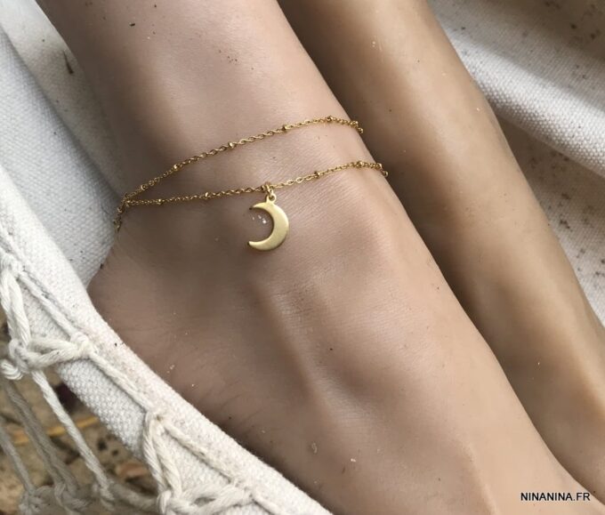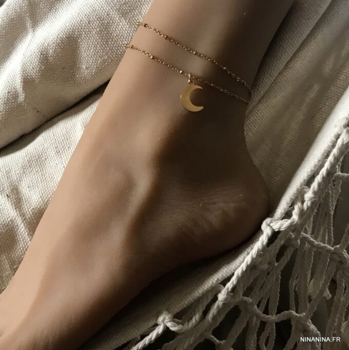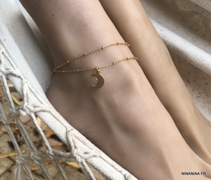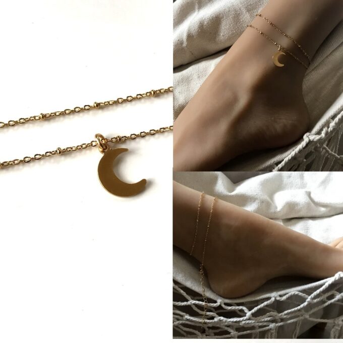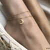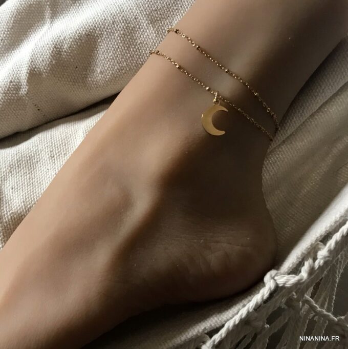 Habillez joliment votre pied avec cette jolie Chaine de cheville double rang lune Acier doré constituée d’une breloque croissant de lune montée sur une chaine maille satelite en Acier inoxydable doré, à enrouler autour de la cheville (2 tours).