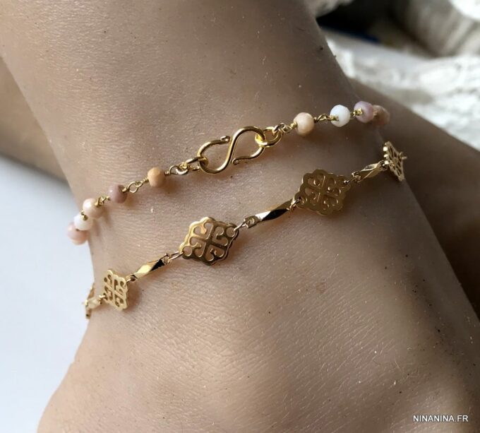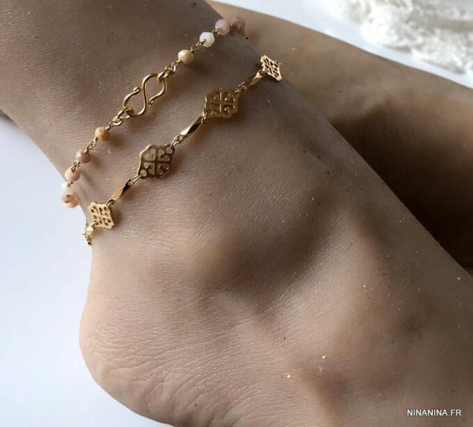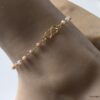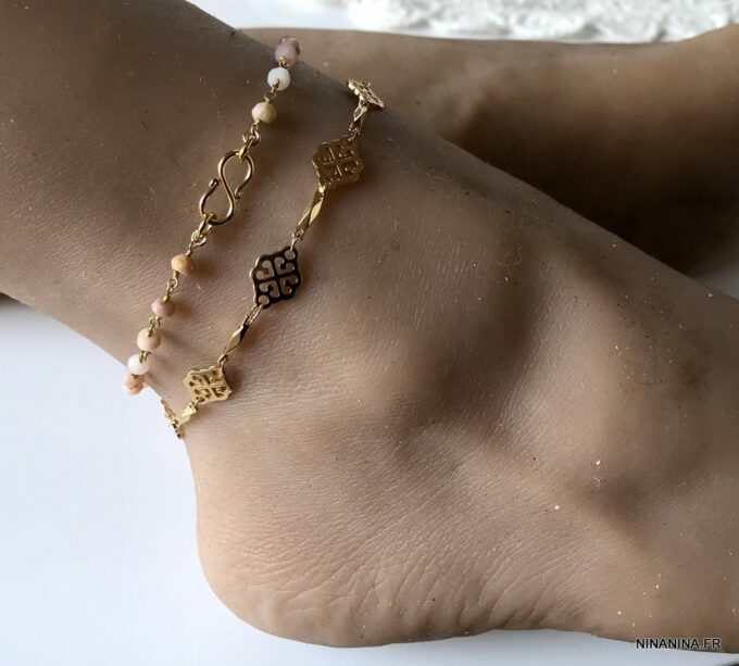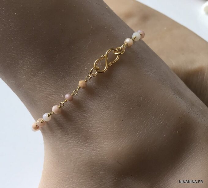 Cette Chaîne de cheville en plaqué or de grande qualité est unique et fabriquée à la main, de façon artisanale dans notre atelier du sud de la France. Il s’agit d’une pièce faite sur mesure. Elle est proposée en 25 cm de longueur. Poids : 2,1 g; Cette chaine de cheville est disponible avec d’autres Pierres Fines ou Précieuses au choix : Pierre de lune, labradorite, améthyste, quartz rose, turquoise blanche, turquoise bleue ou toute autre pierre sur commande (nous consulter). Disponible également avec un fermoir infini en argent 925.