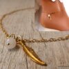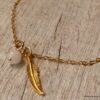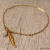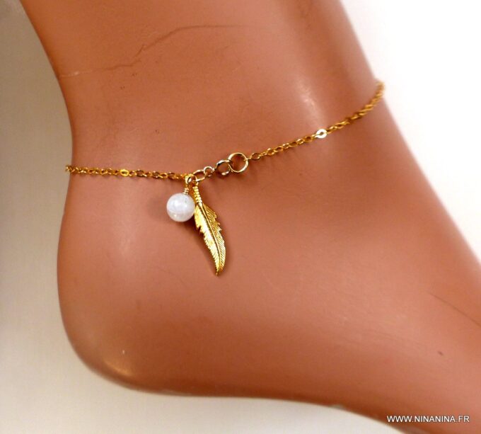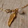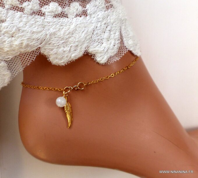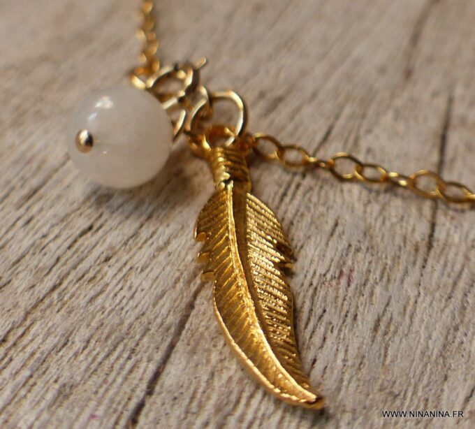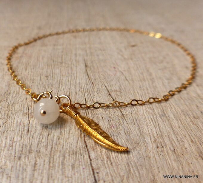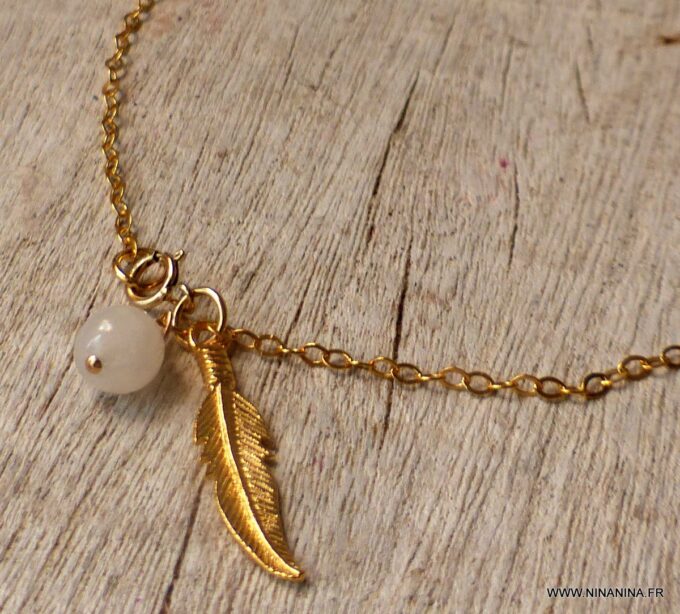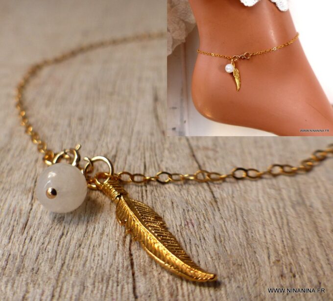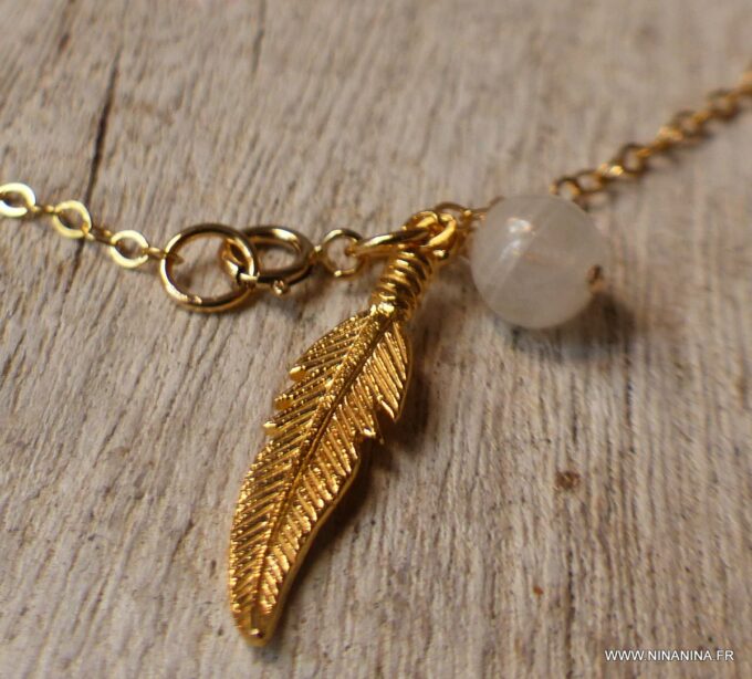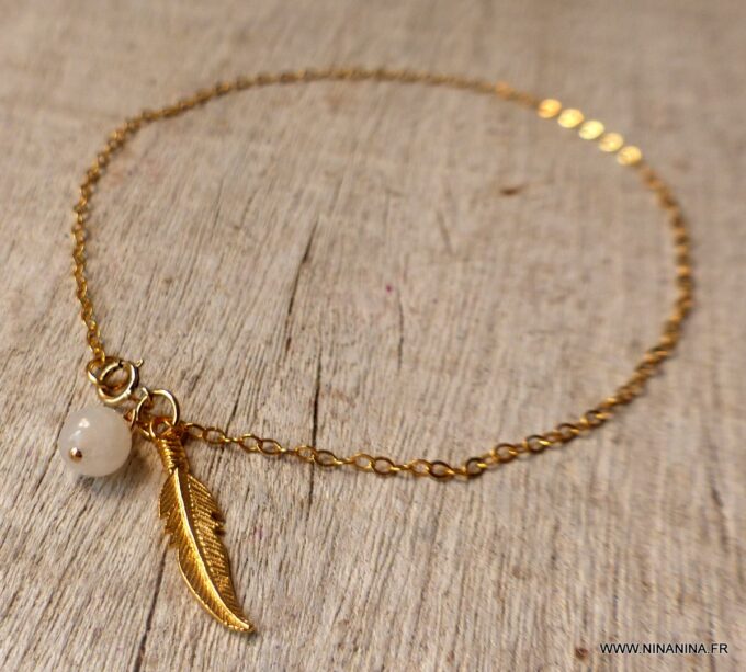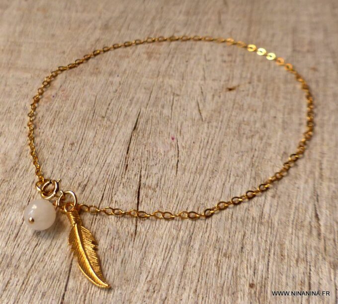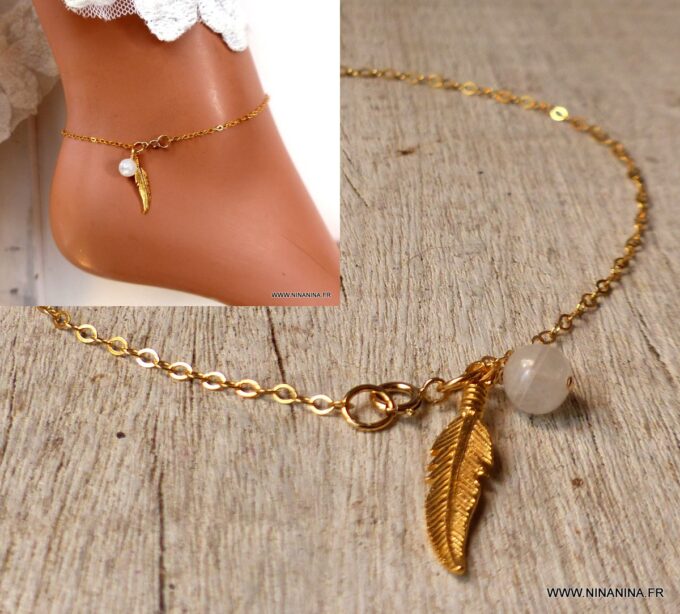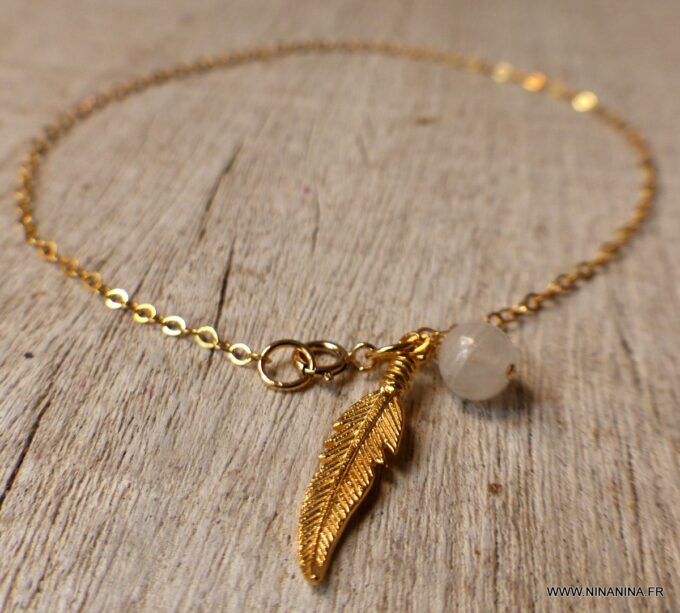 Habillez votre pied de sensualité avec cette Chaine de cheville or plaqué sur argent 925 pierre de lune composée d’un pendentif plume en acier inoxydable doré et une perle ronde en pierre de lune naturelle monté sur une chaine maille forçat en plaqué or 14 carats gold filled. Cette Chaîne de cheville, aussi appelée chevillère ou chaine de pied, est terminée par un fermoir rond à ressort, sûr et facile d’utilisation.