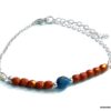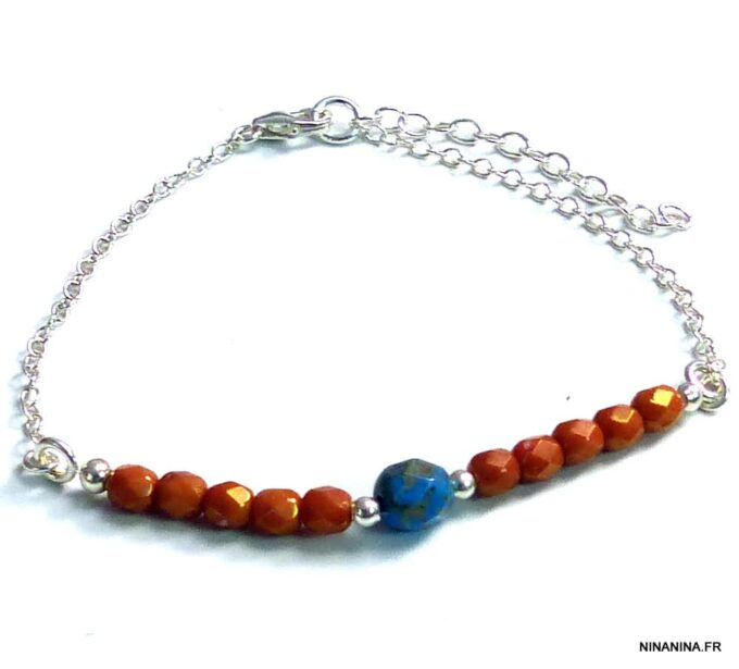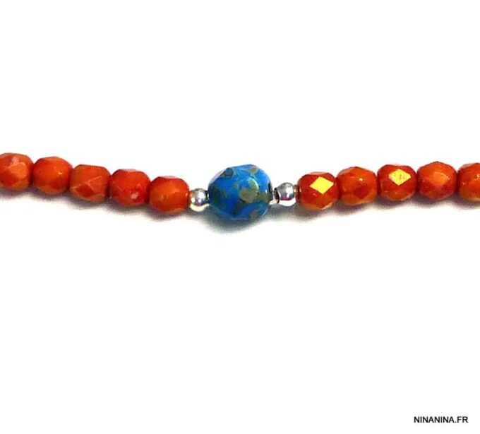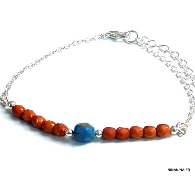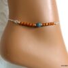 Chaine de cheville perles de bohème argent massif composé d’une perle de bohème bleue facettée et de petites perles orange facettées et argent 925 montées sur une chainette en argent 925. Dim de la perle de bohème: 0,6 X 0,4 cm. Fermoir mousqueton. Longueur (fermoir compris) : 25 cm. Livré dans sa pochette d’organza. Poids : 1 g.