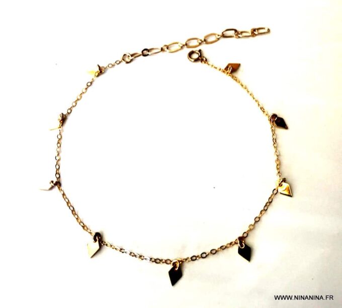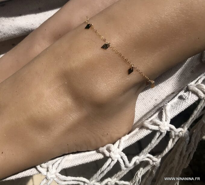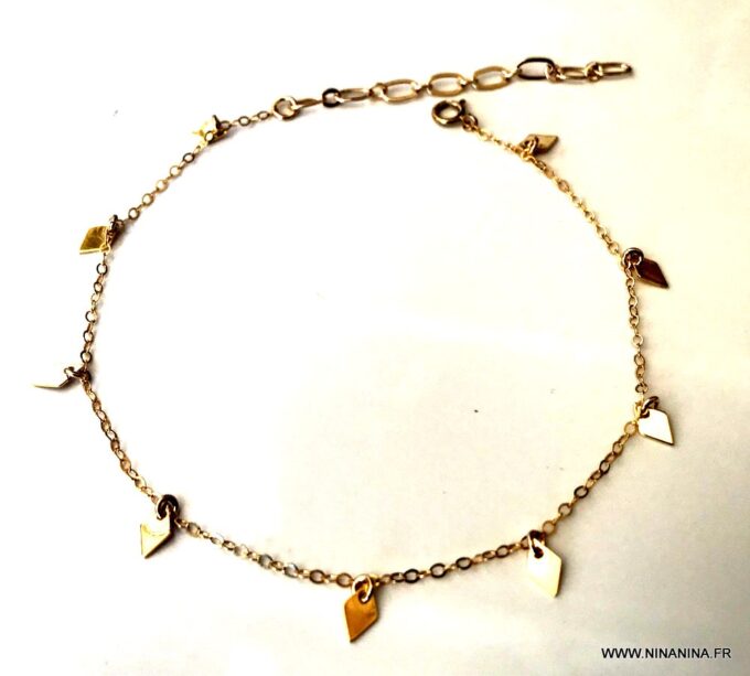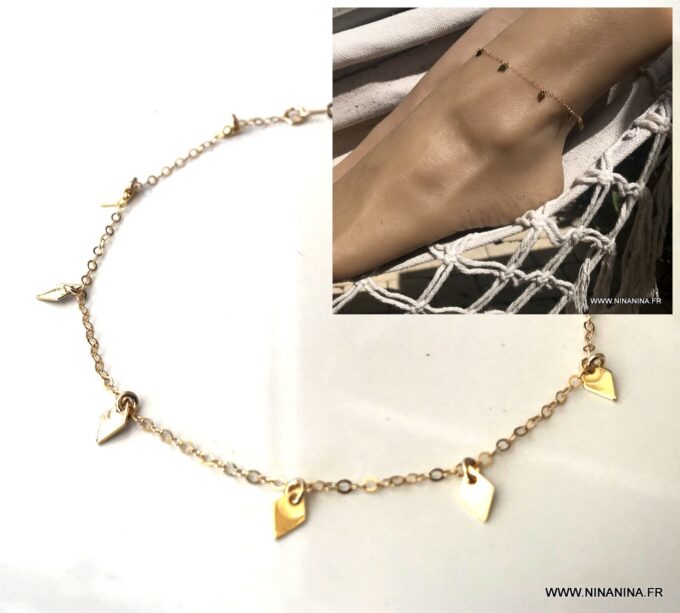 Vous allez craquer pour cette Chaine cheville Or Plaqué bohème chic motif losange doré constituée de losanges en Plaqué Or 14 carats montés sur une chaine maille forçat en Plaqué Or 14 carats. Une chevillière au style bohème chic, discrète et raffinée, avec de petites breloques délicates à l’esprit bohème.