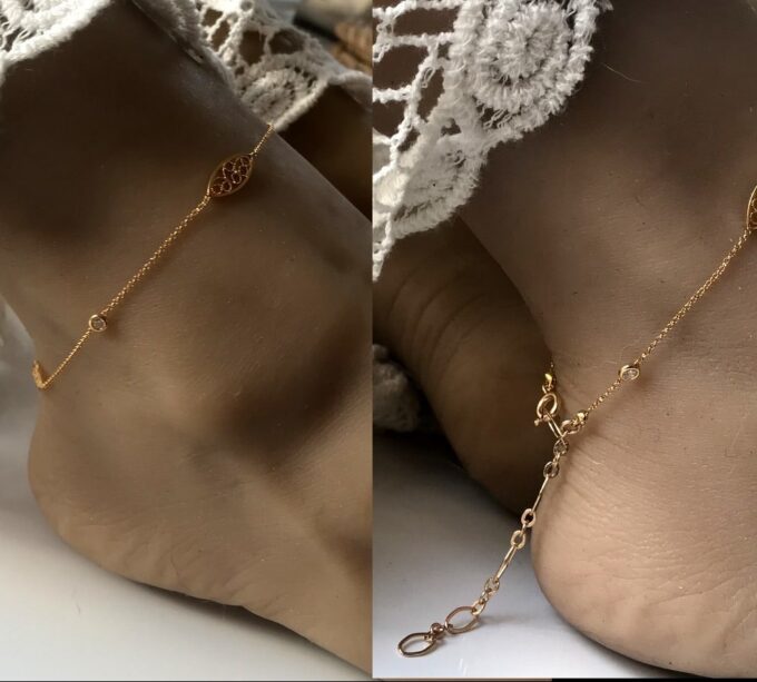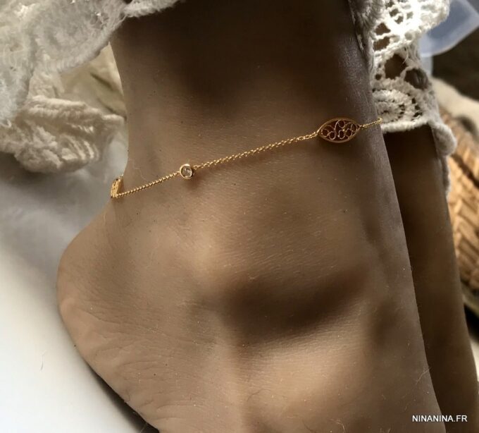 Avec ses petits oxydes de zirconium blancs et ses motifs ovales en or ciselés délicatement répartis sur une chaine en plaqué or 18 carats,  ce splendide bijou de pied plaqué or vous fera tout simplement craquer.