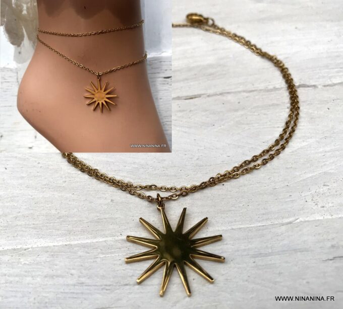En quête d’une chaine de cheville dorée pour cet été ? Optez pour cette Chaine de cheville soleil pour femme acier inoxydable or à enrouler autour de la cheville, que vous pourrez porter sur la plage ou sous un vêtement et qui ne vous quittera plus, été comme hiver! Sensuelle et raffinée, de quoi exprimer toute votre féminité, et jusqu’au bout des pieds!