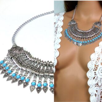 Collier chaine de corps tribale Acier inoxydable argent composée composé d’un pendentif double en métal argenté vieilli et cabochon en magnésite turquoise monté sur une chainette en acier inoxydable. Dim du pendentif : 0,7 X 6,5 cm. Fermoir mousqueton. Longueur du collier : 90 cm. Longueur de la taille (fermoir compris) : 90 cm. Taille unique – s’adapte à toutes les morphologies). Livré dans sa pochette d’organza. Bijou 100% fait-main.
