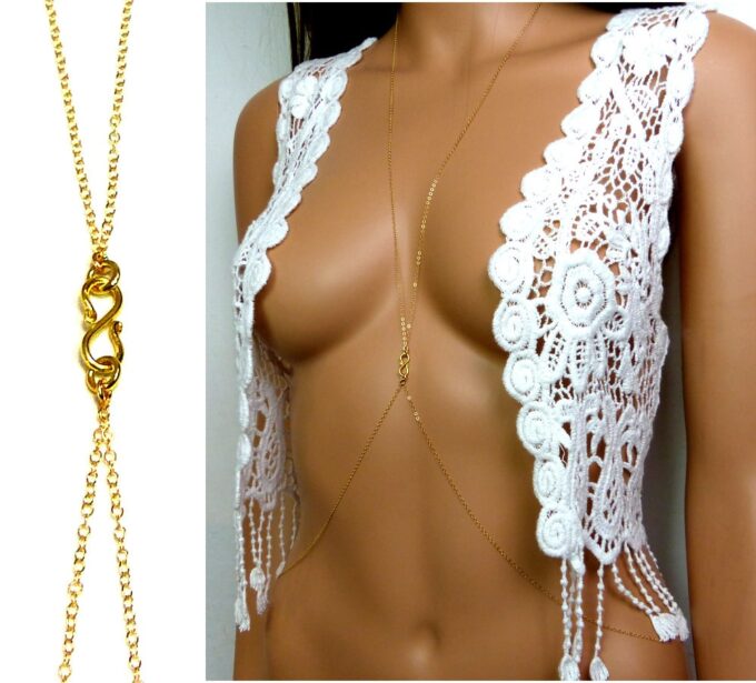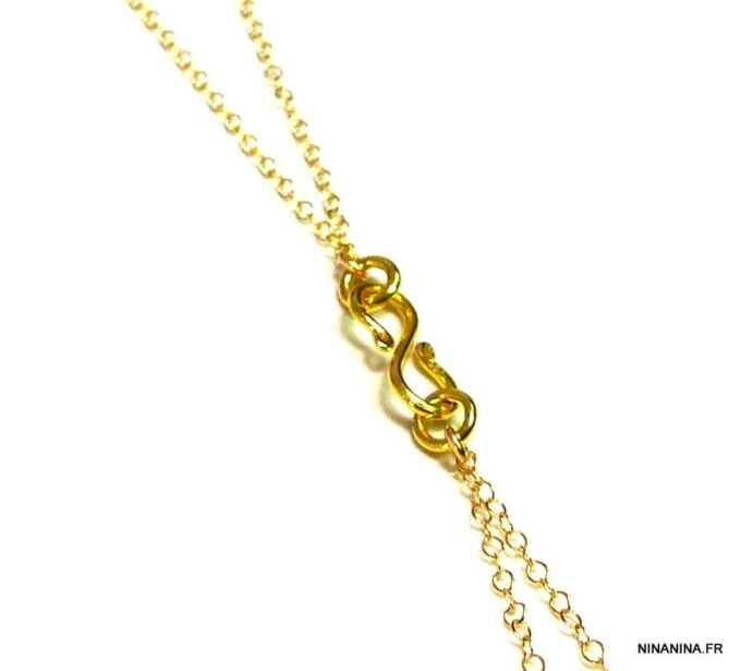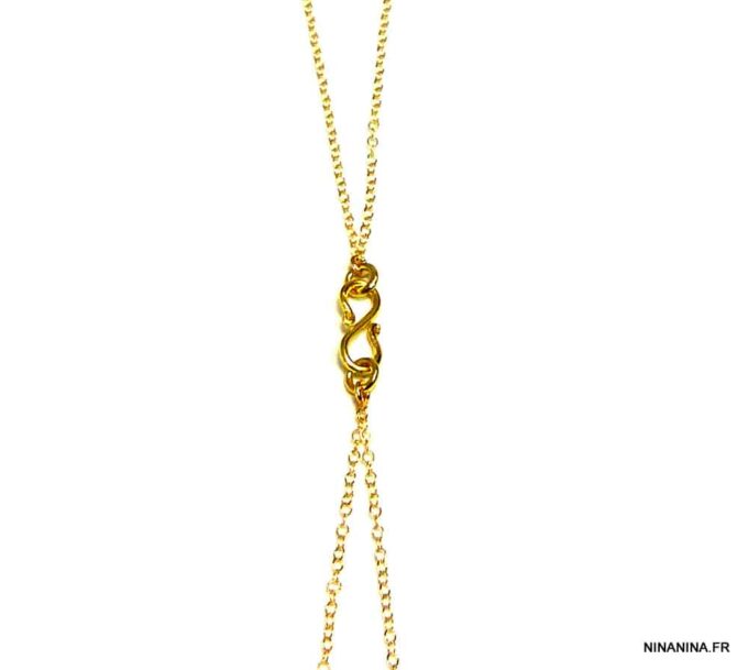 Chaine de corps infini argent massif plaqué or composée d’une entretoise infini en argent massif plaqué or 24 carats montée sur une chaînette en plaqué or 14 carats. Fermoir mousqueton. Longueur du collier : 75 cm. Longueur de la taille (fermoir compris) : 100 cm env. Taille unique. Livré dans sa pochette d’organza. Bijou 100% fait-main. Poids : 4,8 g