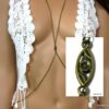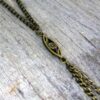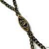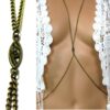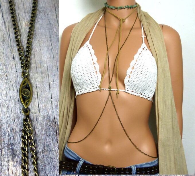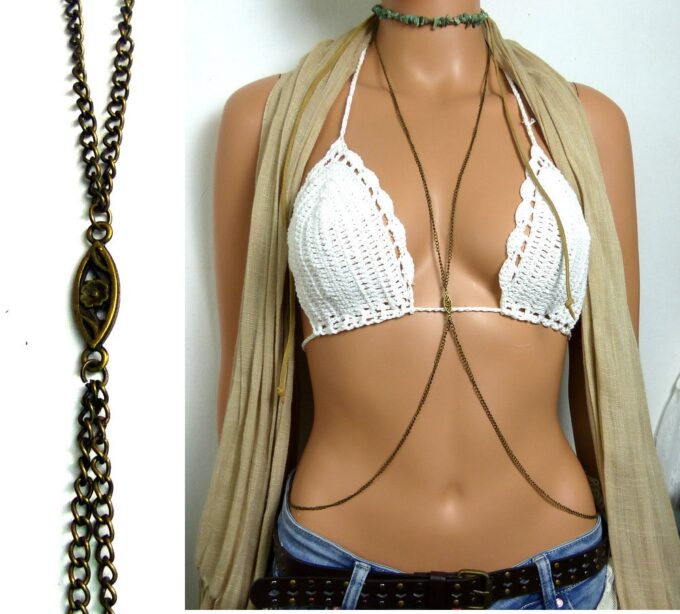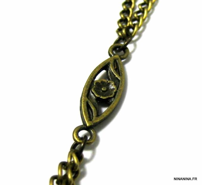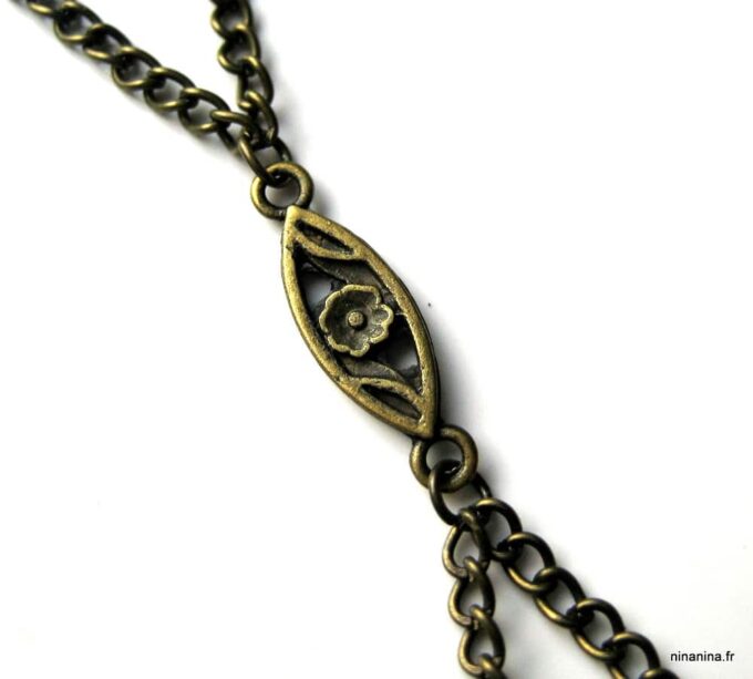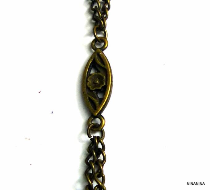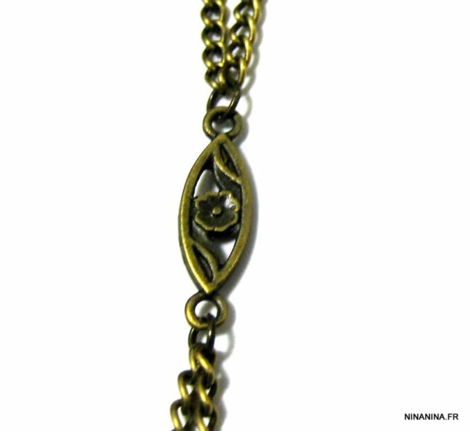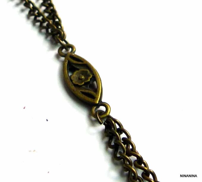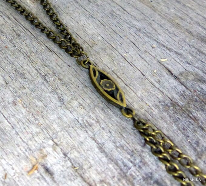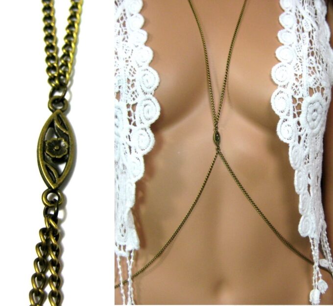 Chaine de corps métal bronze pour femme composée d’une estampe en métal bronze montée sur une chaînette en métal bronze. Fermoir mousqueton . Dim de l’estampe : 2,0 X 0,6 cm env. Longueur du collier : 75 cm. Longueur de la taille (fermoir compris) : 100 cm env. Taille unique. Livré dans sa pochette d’organza. Bijou 100% fait-main.